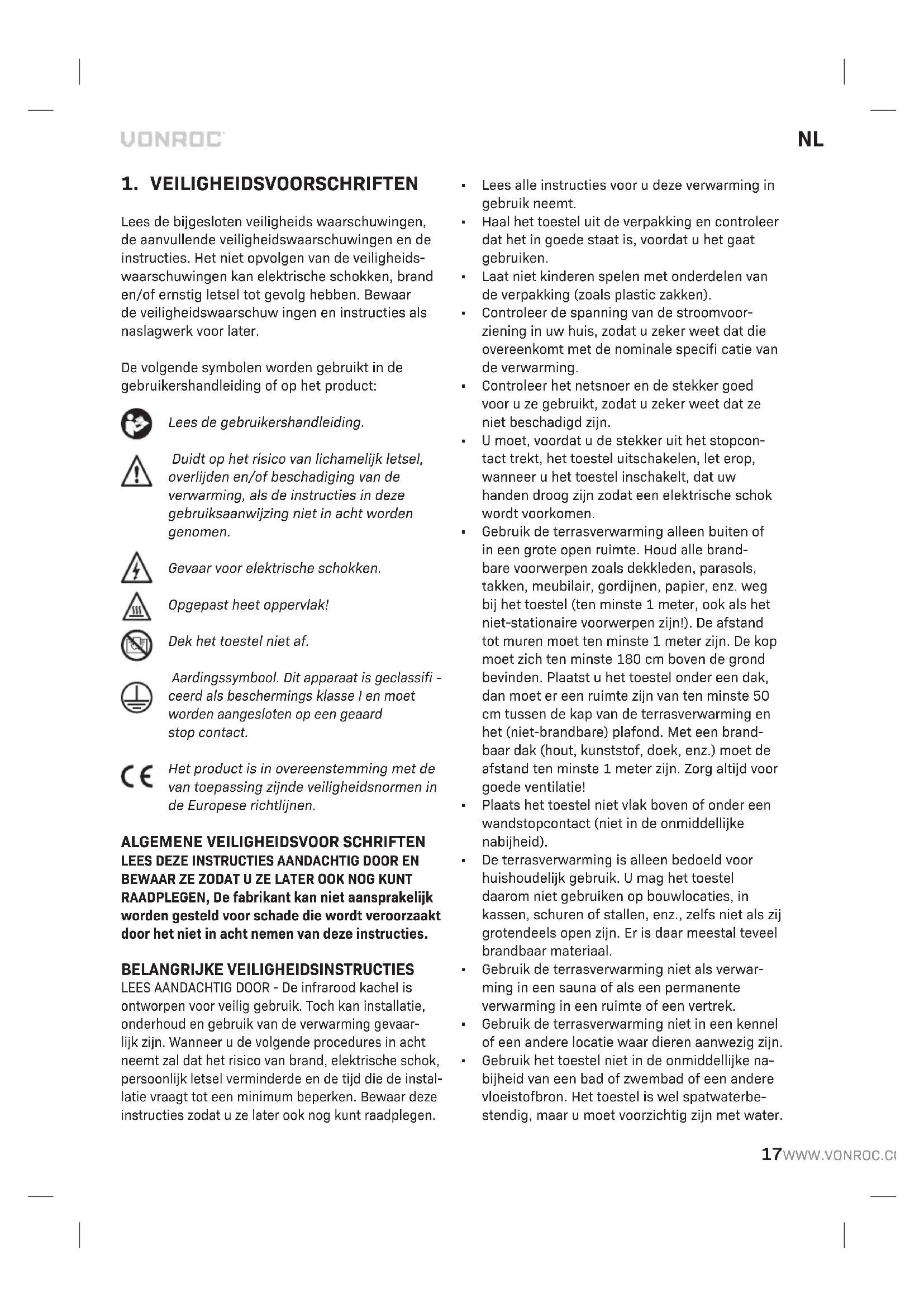 - Controleer dat de Aan/uit-schakelaar in de juiste stand staat, is dat niet het geval, schakel dan de verwarming in. MILIEU Defecte en/of afgedankte elektrische of elektronische gereedschappen dienen ter verwerking te worden aangeboden aan een daarvoor verantwoordelijke instantie. Uitsluitend voor EG-landen Werp elektrisch gereedschap niet weg bij het huisvuil. Conform de Europese Richtlijn 2012/19/ EG voor Afgedankte Elektrische en Elektronische Apparatuur en de implementatie ervan in nationaal recht moet niet langer te gebruiken elektrisch gereedschap gescheiden worden verzameld en op een milieuvriendelijke wijze worden verwerkt. GARANTIE VONROC producten zijn ontworpen volgens de hoogste kwaliteitsstandaarden en gegarandeerd vrij van defecten, zowel materieel als fabrieksfouten, tijdens de wettelijk vastgestelde garantieperiode vanaf de eerste aankoopdatum. Mocht het product tijdens deze periode gebreken vertonen veroorzaakt door defecte materialen en/of fabrieksfouten, neem dan rechtstreeks contact op met VONROC. De volgende situaties vallen niet onder de garantie: