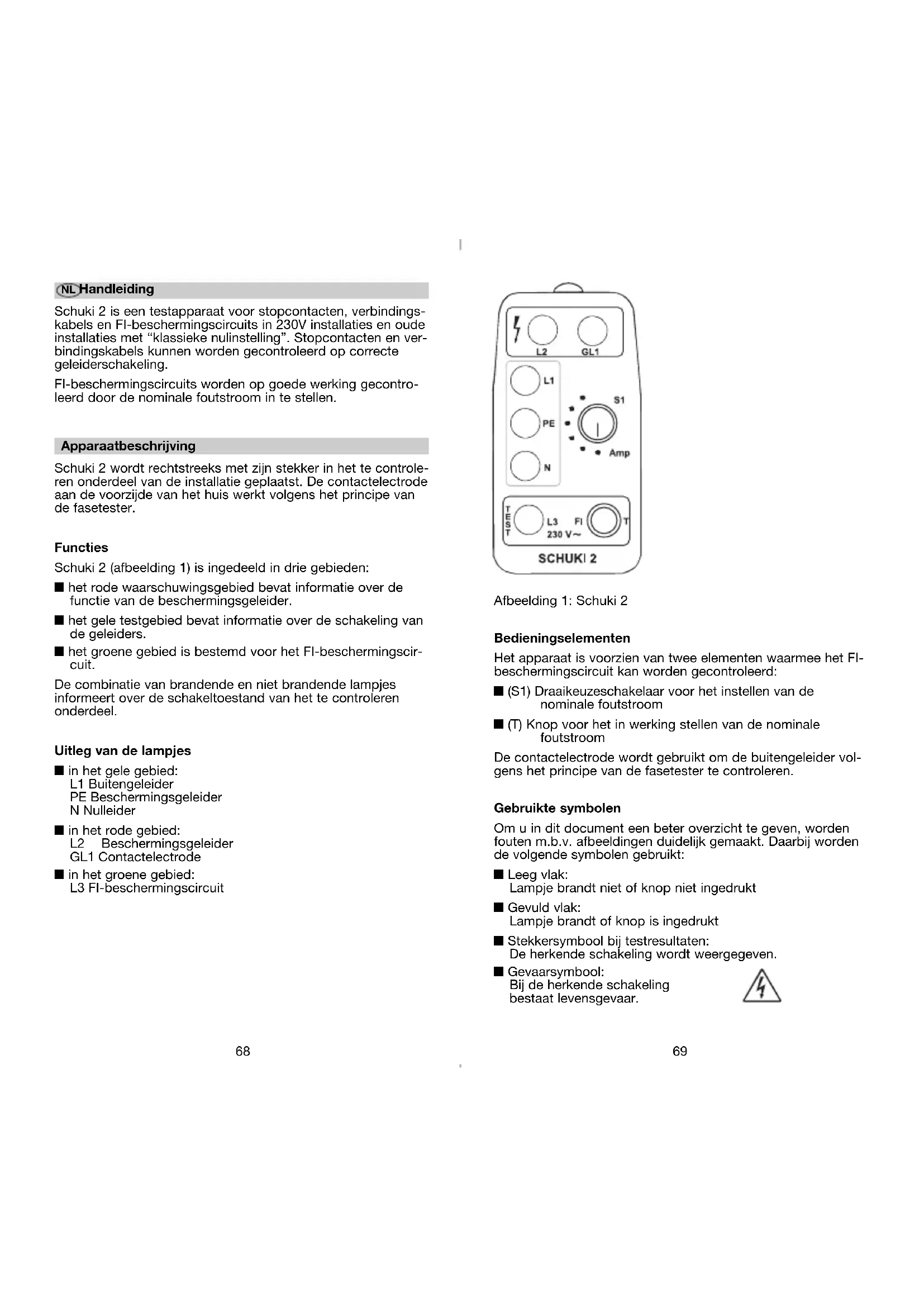 NL Handleiding Schuki 2 is een testapparaat voor stopcontacten, verbindings- kabels en FI-beschermingscircuits in 230V installaties en oude installaties met “klassieke nulinstelling”. Stopcontacten en ver- bindingskabels kunnen worden gecontroleerd op correcte geleiderschakeling. FI-beschermingscircuits worden op goede werking gecontro- leerd door de nominale foutstroom in te stellen. Apparaatbeschrijving Schuki 2 wordt rechtstreeks met zijn stekker in het te controle- ren onderdeel van de installatie geplaatst. De contactelectrode aan de voorzijde van het huis werkt volgens het principe van de fasetester. Functies Schuki 2 (afbeelding 1) is ingedeeld in drie gebieden: y het rode waarschuwingsgebied bevat informatie over de functie van de beschermingsgeleider. y het gele testgebied bevat informatie over de schakeling van de geleiders. y het groene gebied is bestemd voor het FI-beschermingscir- cuit. De combinatie van brandende en niet brandende lampjes informeert over de schakeltoestand van het te controleren onderdeel. Uitleg van de lampjes y in het gele gebied: L1 Buitengeleider PE Beschermingsgeleider N Nulleider y in het rode gebied: L2 Beschermingsgeleider GL1 Contactelectrode y in het groene gebied: L3 FI-beschermingscircuit Schuki 2 22.01.2004 15:49 Uhr Seite 6871 Weergave van fouten Geen stroomloop Geen lampje brandt. Raak nu de electrode aan. Indien nu geen lampje gaat branden, dan is de buitengeleider niet geschakeld. Indien een lampje in het gele gebied gaat branden, dan is de buitengeleider gekoppeld aan de overeenkomstige aansluiting. Apparaat verkeerd aangesloten Afbeelding 4: De lampjes L1 en PE branden. GL1 gaat bran- den bij aanraking van de electrode. Neem absoluut de fout in acht die in afbeelding 5 weerge- geven is. Afbeelding 3: De lampjes N, L1 en L2 branden. Bij aanraken van de electrode gaat GL1 niet branden. De buitengeleider is niet aan het linker stekkercontact van het testapparaat gekoppeld (zicht op de displayzijde) en dus niet testklaar. Schuki 2 omdraaien en opnieuw aansluiten. Nulleider ontbreekt