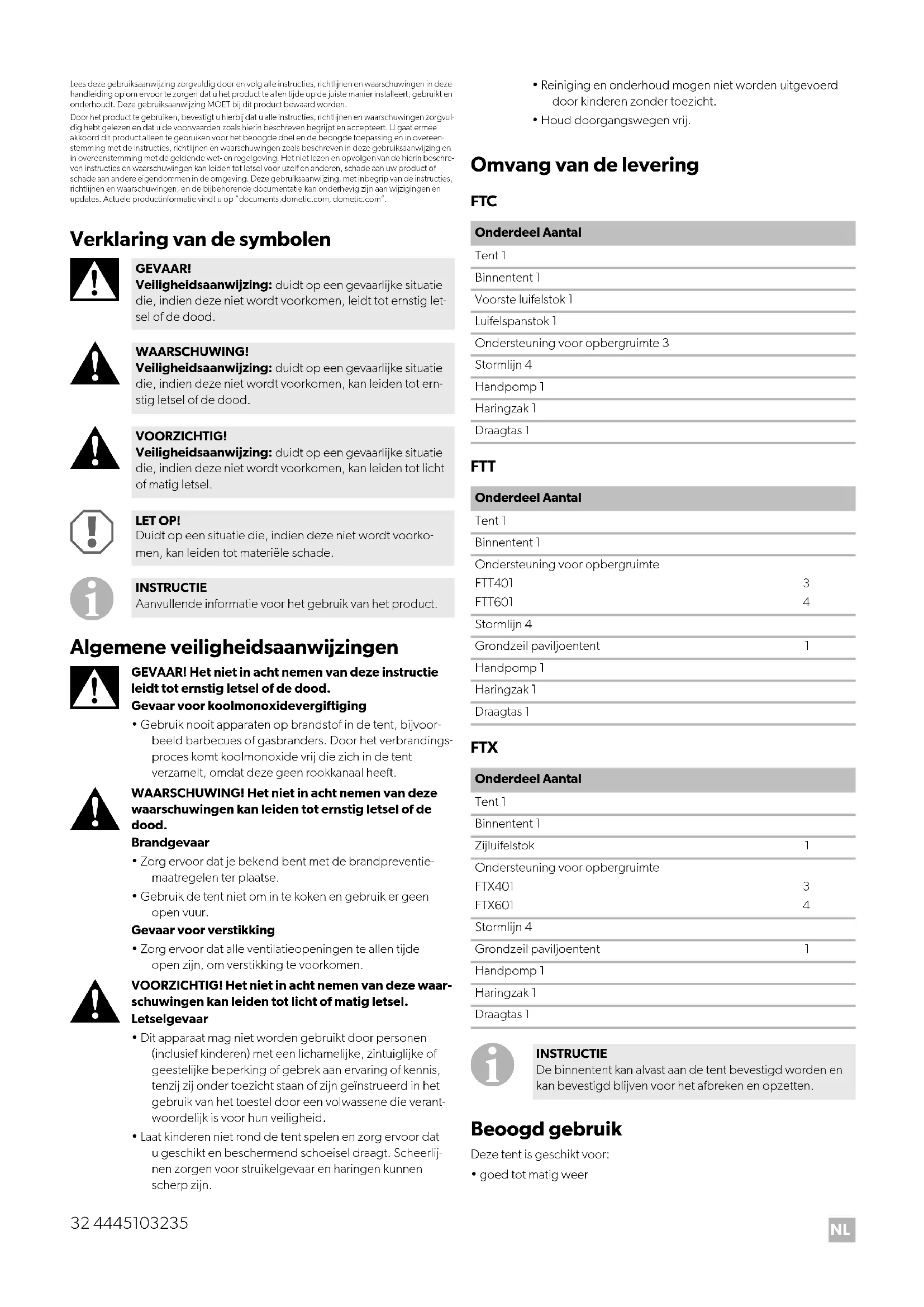 - goed tot matig weer GEVAAR! Veiligheidsaanwijzing: duidt op een gevaarlijke situatie die, indien deze niet wordt voorkomen, leidt tot ernstig let- sel of de dood. WAARSCHUWING! Veiligheidsaanwijzing: duidt op een gevaarlijke situatie die, indien deze niet wordt voorkomen, kan leiden tot ern- stig letsel of de dood. VOORZICHTIG! Veiligheidsaanwijzing: duidt op een gevaarlijke situatie die, indien deze niet wordt voorkomen, kan leiden tot licht of matig letsel. LET OP! Duidt op een situatie die, indien deze niet wordt voorko- men, kan leiden tot materiële schade. INSTRUCTIE Aanvullende informatie voor het gebruik van het product. Onderdeel Aantal Tent 1 Binnentent 1 Voorste luifelstok 1 Luifelspanstok 1 Ondersteuning voor opbergruimte 3 Stormlijn 4 Handpomp 1 Haringzak 1 Draagtas 1 Onderdeel Aantal Tent 1 Binnentent 1 Ondersteuning voor opbergruimte FTT401 FTT601