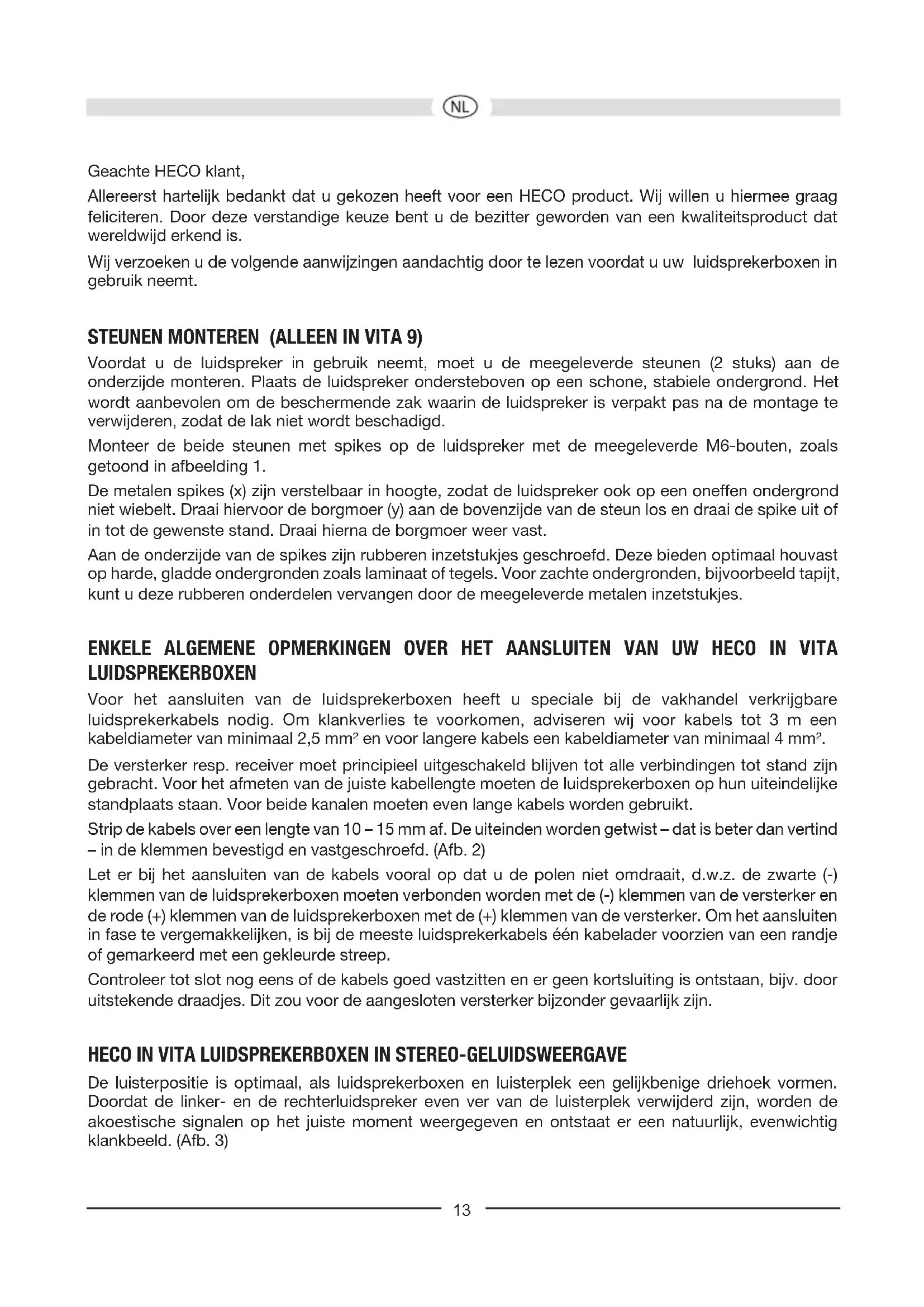 12Geachte HECO klant, Allereerst hartelijk bedankt dat u gekozen heeft voor een HECO product. Wij willen u hiermee graag feliciteren. Door deze verstandige keuze bent u de bezitter geworden van een kwaliteitsproduct dat wereldwijd erkend is. Wij verzoeken u de volgende aanwijzingen aandachtig door te lezen voordat u uw luidsprekerboxen in gebruik neemt. STEUNEN MONTEREN (ALLEEN IN VITA 9) Voordat u de luidspreker in gebruik neemt, moet u de meegeleverde steunen (2 stuks) aan de onderzijde monteren. Plaats de luidspreker ondersteboven op een schone, stabiele ondergrond. Het wordt aanbevolen om de beschermende zak waarin de luidspreker is verpakt pas na de montage te verwijderen, zodat de lak niet wordt beschadigd. Monteer de beide steunen met spikes op de luidspreker met de meegeleverde M6-bouten, zoals getoond in afbeelding 1. De metalen spikes (x) zijn verstelbaar in hoogte, zodat de luidspreker ook op een oneffen ondergrond niet wiebelt. Draai hiervoor de borgmoer (y) aan de bovenzijde van de steun los en draai de spike uit of in tot de gewenste stand. Draai hierna de borgmoer weer vast. Aan de onderzijde van de spikes zijn rubberen inzetstukjes geschroefd. Deze bieden optimaal houvast op harde, gladde ondergronden zoals laminaat of tegels. Voor zachte ondergronden, bijvoorbeeld tapijt, kunt u deze rubberen onderdelen vervangen door de meegeleverde metalen inzetstukjes. ENKELE ALGEMENE OPMERKINGEN OVER HET AANSLUITEN VAN UW HECO IN VITA LUIDSPREKERBOXEN Voor het aansluiten van de luidsprekerboxen heeft u speciale bij de vakhandel verkrijgbare luidsprekerkabels nodig. Om klankverlies te voorkomen, adviseren wij voor kabels tot 3 m een kabeldiameter van minimaal 2,5 mm² en voor langere kabels een kabeldiameter van minimaal 4 mm². De versterker resp. receiver moet principieel uitgeschakeld blijven tot alle verbindingen tot stand zijn gebracht. Voor het afmeten van de juiste kabellengte moeten de luidsprekerboxen op hun uiteindelijke standplaats staan. Voor beide kanalen moeten even lange kabels worden gebruikt. Strip de kabels over een lengte van 10 – 15 mm af. De uiteinden worden getwist – dat is beter dan vertind – in de klemmen bevestigd en vastgeschroefd. (Afb. 2) Let er bij het aansluiten van de kabels vooral op dat u de polen niet omdraait, d.w.z. de zwarte (-) klemmen van de luidsprekerboxen moeten verbonden worden met de (-) klemmen van de versterker en de rode (+) klemmen van de luidsprekerboxen met de (+) klemmen van de versterker. Om het aansluiten in fase te vergemakkelijken, is bij de meeste luidsprekerkabels één kabelader voorzien van een randje of gemarkeerd met een gekleurde streep. Controleer tot slot nog eens of de kabels goed vastzitten en er geen kortsluiting is ontstaan, bijv. door uitstekende draadjes. Dit zou voor de aangesloten versterker bijzonder gevaarlijk zijn.