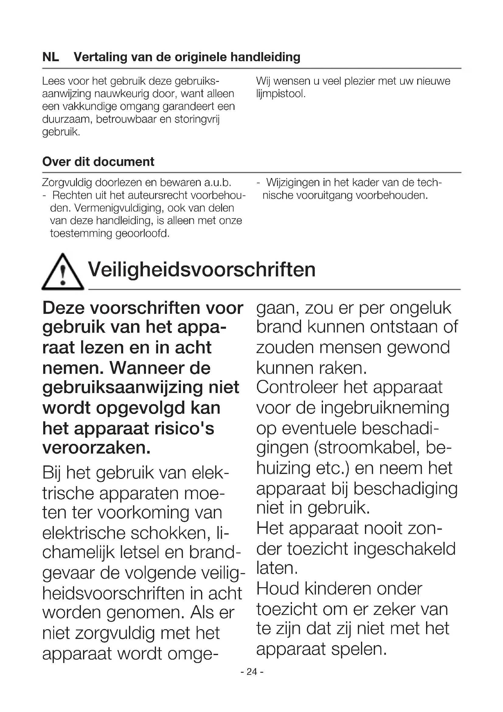 DE GARANTIE FABRICANT DE GARANTIE ANS FABRICANT DE GARANTIE ANS FABRICANT Garantie du fabricant- 24 - Deze voorschriften voor gebruik van het appa- raat lezen en in acht nemen. Wanneer de gebruiksaanwijzing niet wordt opgevolgd kan het apparaat risico's veroorzaken. Bij het gebruik van elek- trische apparaten moe- ten ter voorkoming van elektrische schokken, li- chamelijk letsel en brand- gevaar de volgende veilig- heidsvoorschriften in acht worden genomen. Als er niet zorgvuldig met het apparaat wordt omge- gaan, zou er per ongeluk brand kunnen ontstaan of zouden mensen gewond kunnen raken. Controleer het apparaat voor de ingebruikneming op eventuele beschadi- gingen (stroomkabel, be- huizing etc.) en neem het apparaat bij beschadiging niet in gebruik. Het apparaat nooit zon- der toezicht ingeschakeld laten. Houd kinderen onder toezicht om er zeker van te zijn dat zij niet met het apparaat spelen. Lees voor het gebruik deze gebruiks- aanwijzing nauwkeurig door, want alleen een vakkundige omgang garandeert een duurzaam, betrouwbaar en storingvrij gebruik. Wij wensen u veel plezier met uw nieuwe lijmpistool. Vertaling van de originele handleiding Over dit document Zorgvuldig doorlezen en bewaren a.u.b. - Rechten uit het auteursrecht voorbehou- den. Vermenigvuldiging, ook van delen van deze handleiding, is alleen met onze toestemming geoorloofd. - Wijzigingen in het kader van de tech- nische vooruitgang voorbehouden. Veiligheidsvoorschriften NL- 25 -