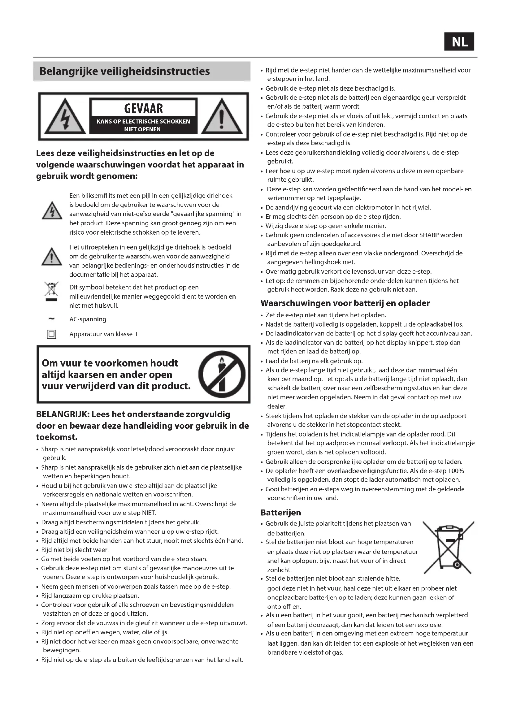 - Sharp is niet aansprakelijk voor letsel/dood veroorzaakt door onjuist gebruik.• Sharp is niet aansprakelijk als de gebruiker zich niet aan de plaatselijke wetten en beperkingen houdt.• Houd u bij het gebruik van uw e-step altijd aan de plaatselijke verkeersregels en nationale wetten en voorschriften.• Neem altijd de plaatselijke maximumsnelheid in acht. Overschrijd de maximumsnelheid voor uw e-step NIET.• Draag altijd beschermingsmiddelen tijdens het gebruik.• Draag altijd een veiligheidshelm wanneer u op uw e-step rijdt.• Rijd altijd met beide handen aan het stuur, nooit met slechts één hand.• Rijd niet bij slecht weer.• Ga met beide voeten op het voetbord van de e-step staan.• Gebruik deze e-step niet om stunts of gevaarlijke manoeuvres uit te voeren. Deze e-step is ontworpen voor huishoudelijk gebruik.• Neem geen mensen of voorwerpen zoals tassen mee op de e-step.• Rijd langzaam op drukke plaatsen.• Controleer voor gebruik of alle schroeven en bevestigingsmiddelen vastzitten en of deze er goed uitzien.• Zorg ervoor dat de vouwas in de gleuf zit wanneer u de e-step uitvouwt.• Rijd niet op one en wegen, water, olie of ijs.• Rij niet door het verkeer en maak geen onvoorspelbare, onverwachte bewegingen.• Rijd niet op de e-step als u buiten de leeftijdsgrenzen van het land valt.• Rijd met de e-step niet harder dan de wettelijke maximumsnelheid voor e-steppen in het land.• Gebruik de e-step niet als deze beschadigd is.• Gebruik de e-step niet als de batterij een eigenaardige geur verspreidt en/of als de batterij warm wordt.• Gebruik de e-step niet als er vloeistof uit lekt, vermijd contact en plaats de e-step buiten het bereik van kinderen.• Controleer voor gebruik of de e-step niet beschadigd is. Rijd niet op de e-step als deze beschadigd is.• Lees deze gebruikershandleiding volledig door alvorens u de e-step gebruikt.• Leer hoe u op uw e-step moet rijden alvorens u deze in een openbare ruimte gebruikt.