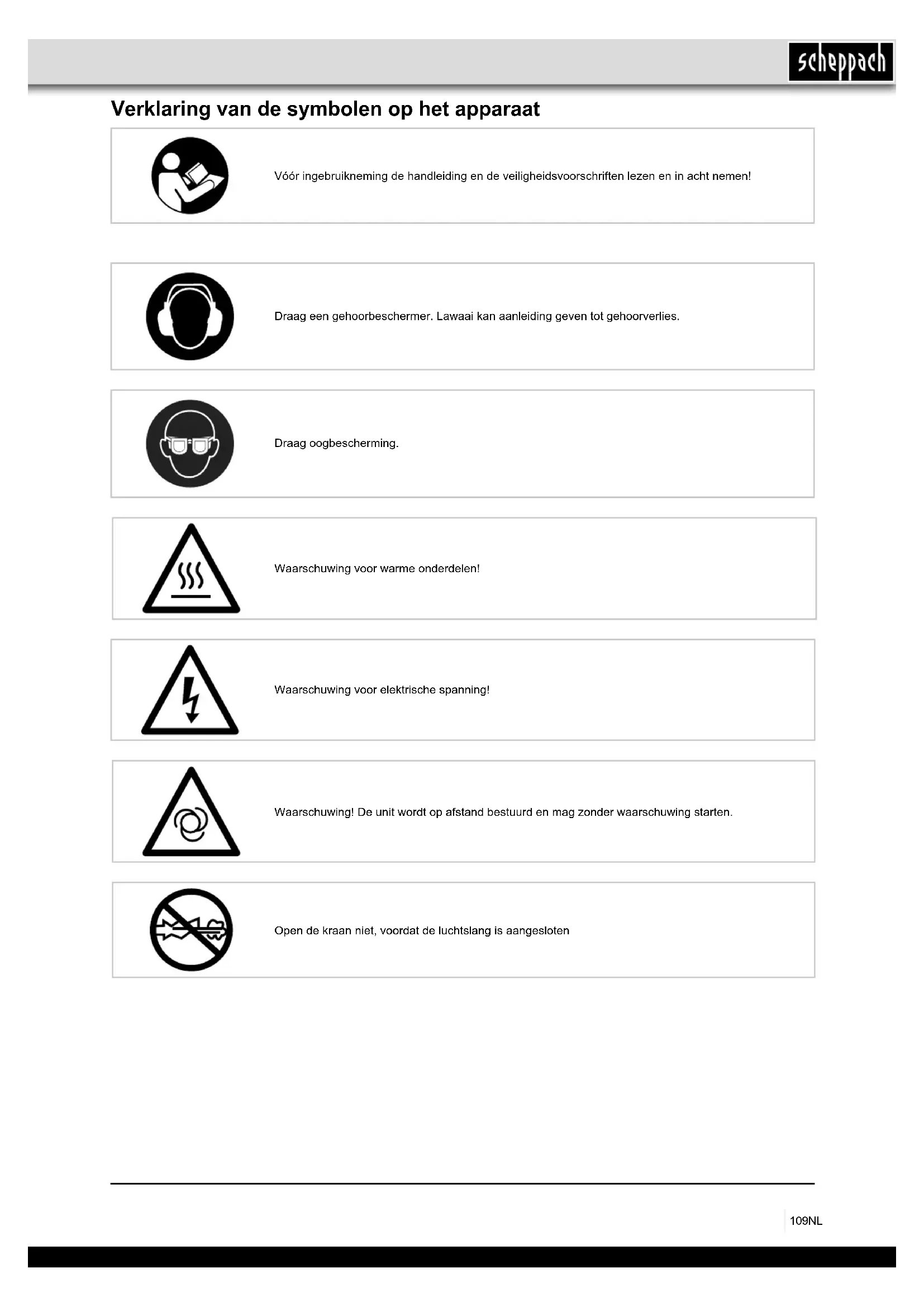 - Skru trykregulator yderligere fast109NL Verklaring van de symbolen op het apparaat Vóór ingebruikneming de handleiding en de veiligheidsvoorschriften lezen en in acht nemen! Waarschuwing voor elektrische spanning! Waarschuwing! De unit wordt op afstand bestuurd en mag zonder waarschuwing starten. Draag een gehoorbeschermer. Lawaai kan aanleiding geven tot gehoorverlies. Waarschuwing voor warme onderdelen! Open de kraan niet, voordat de luchtslang is aangesloten Draag oogbescherming.110 NL Technische gegevens