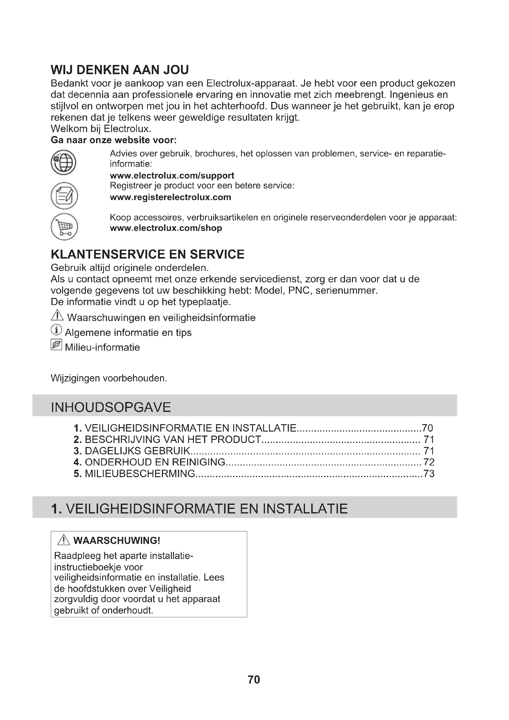 Gebruik altijd originele onderdelen. Als u contact opneemt met onze erkende servicedienst, zorg er dan voor dat u de volgende gegevens tot uw beschikking hebt: Model, PNC, serienummer. De informatie vindt u op het typeplaatje. Waarschuwingen en veiligheidsinformatie Algemene informatie en tips Milieu-informatie Wijzigingen voorbehouden. INHOUDSOPGAVE