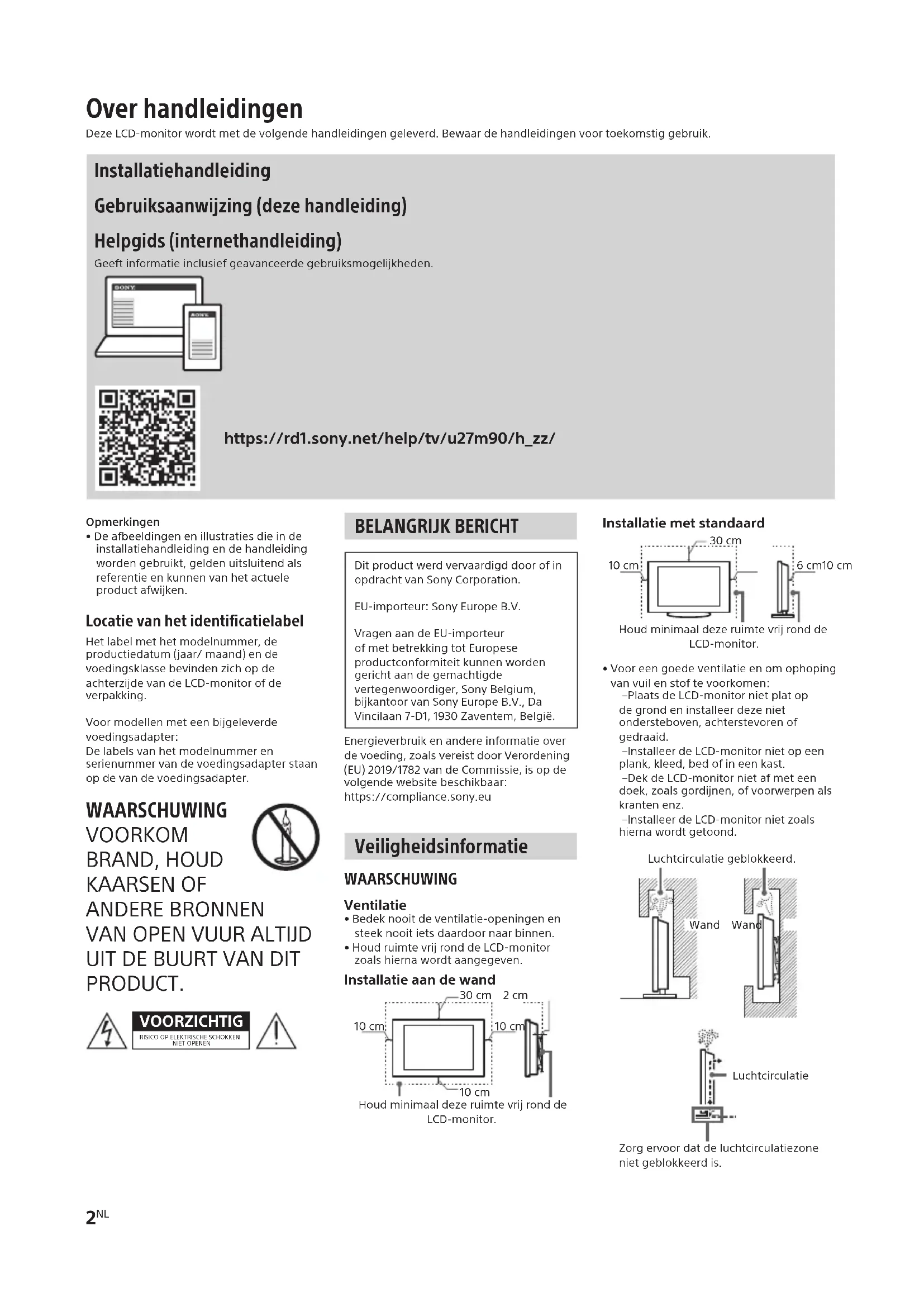 Opmerkingen•Deafbeeldingenenillustratiesdieindeinstallatiehandleidingendehandleidingwordengebruikt,geldenuitsluitendalsreferentieenkunnenvanhetactueleproductafwijken. Locatie van het identificatielabel Hetlabelmethetmodelnummer,deproductiedatum(jaar/maand)endevoedingsklassebevindenzichopdeachterzijdevandeLCD-monitorofdeverpakking.Voormodellenmeteenbijgeleverdevoedingsadapter:Delabelsvanhetmodelnummerenserienummervandevoedingsadapterstaanopdevandevoedingsadapter. WAARSCHUWING VOORKOM BRAND,HOUD KAARSENOF ANDEREBRONNEN VANOPENVUURALTIJD UITDEBUURTVANDIT PRODUCT. VOORZICHTIGRISICOOPELEKTRISCHESCHOKKENNIETOPENEN BELANGRIJK BERICHT DitproductwerdvervaardigddoorofinopdrachtvanSonyCorporation.EU-importeur:SonyEuropeB.V.VragenaandeEU-importeurofmetbetrekkingtotEuropeseproductconformiteitkunnenwordengerichtaandegemachtigdevertegenwoordiger,SonyBelgium,bijkantoorvanSonyEuropeB.V.,DaVincilaan7-D1,1930Zaventem,België.Energieverbruikenandereinformatieoverdevoeding,zoalsvereistdoorVerordening(EU)2019/1782vandeCommissie,isopdevolgendewebsitebeschikbaar:https://compliance.sony.eu Veiligheidsinformatie WAARSCHUWING Ventilatie•Bedeknooitdeventilatie-openingenensteeknooitietsdaardoornaarbinnen.•HoudruimtevrijronddeLCD-monitorzoalshiernawordtaangegeven.Installatie aan de wandHoudminimaaldezeruimtevrijronddeLCD-monitor.10cm30cm 2cm10cm10cmInstallatie met standaardHoudminimaaldezeruimtevrijronddeLCD-monitor.6cm10cm30cm10cm•Vooreengoedeventilatieenomophopingvanvuilenstoftevoorkomen:– PlaatsdeLCD-monitornietplatopdegrondeninstalleerdezenietondersteboven,achterstevorenofgedraaid.– InstalleerdeLCD-monitornietopeenplank,kleed,bedofineenkast.– DekdeLCD-monitornietafmeteendoek,zoalsgordijnen,ofvoorwerpenalskrantenenz.– InstalleerdeLCD-monitornietzoalshiernawordtgetoond.Luchtcirculatiegeblokkeerd.Wand WandLuchtcirculatieZorgervoordatdeluchtcirculatiezonenietgeblokkeerdis. Over handleidingen DezeLCD-monitorwordtmetdevolgendehandleidingengeleverd.Bewaardehandleidingenvoortoekomstiggebruik. Installatiehandleiding Gebruiksaanwijzing (deze handleiding) Helpgids (internethandleiding) Geeftinformatieinclusiefgeavanceerdegebruiksmogelijkheden.https://rd1.sony.net/help/tv/u27m90/h_zz/SDM-U27M90 5-042-069-31(2)