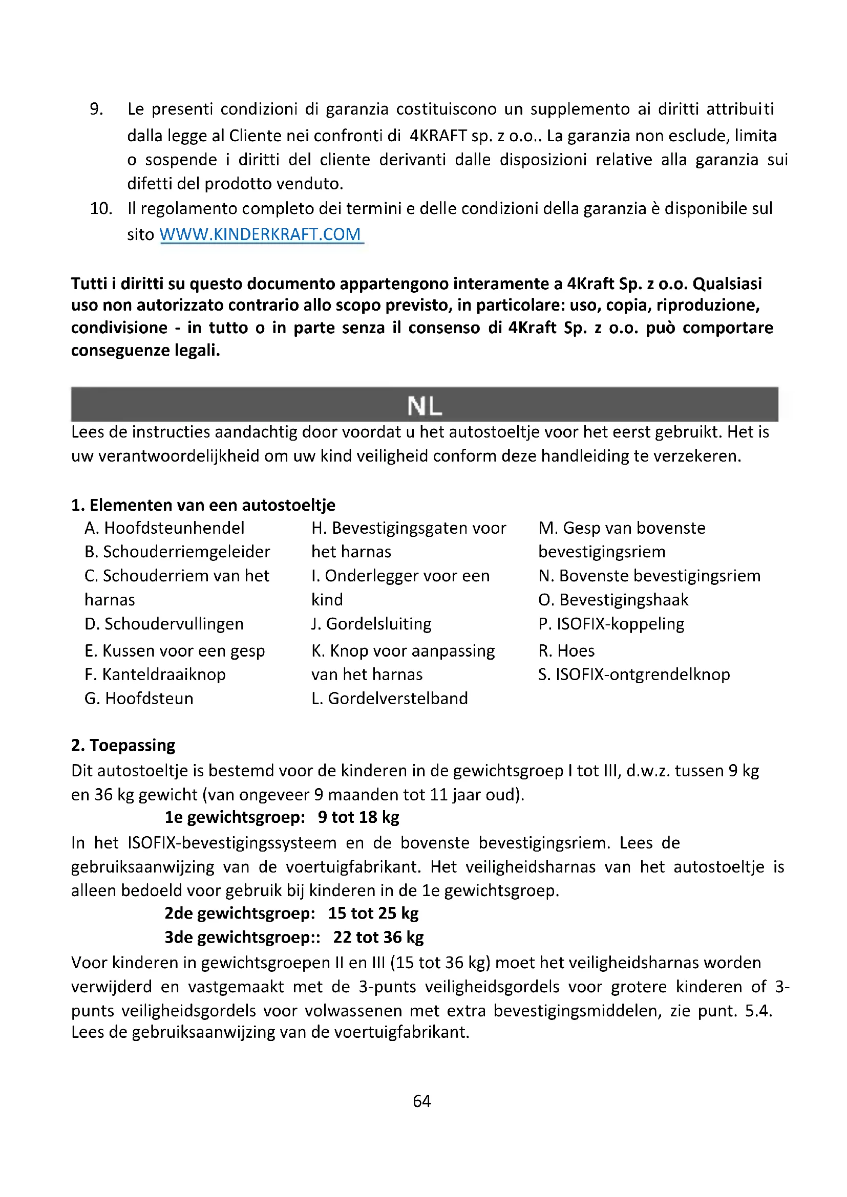 ● Neem even de tijd om deze handleiding door te lezen, om de veiligheid van uw kind te waarborgen. Roekeloos en oneigenlijk gebruik van het autostoeltje kan veel verwondingen veroorzaken. ● Gebruik het autostoeltje alleen in de voorwaarts gerichte positie. ● Plaats dit kinderzitje NIET op autostoelen met een actieve airbag aan de voorzijde, omdat dit gevaarlijk kan zijn. Dit geldt niet voor zijairbags. ● Als het kinderzitje op de voorbank wardt geïnstalleerd, deactiveer dan de airbag of verplaats de passagiersstoel zo ver mogelijk naar achteren (raadpleeg de handleiding van de auto). ● Het wordt aanbevolen om het autostoeltje alleen op de achterbank van de auto te installeren. ● Raadpleeg de handleiding van de auto voor tips over de geschiktheid van het autobank voor gebruik met een kinderzitje. ● Alleen geschikt voor installatie als de goedgekeurde voertuigen zijn uitgerust met driepuntsgordels die volgens VN / ECE-Reglement nr. 16 of andere gelijkwaardige normen zijn goedgekeurd. ● Denk eraan dat alle gordels die het kinderstoeltje aan het voertuig bevestigen, strak moeten zijn; de gordels van het kinderzitje waren aan zijn lichaamsstructuur bevestigd en de gordels / riemen waren niet gedraaid. ● Het autostoeltje moet na een auto-ongeluk worden vervangen. ● Het autostoeltje mag niet worden gewijzigd. ● Bescherm het autostoeltje tegen direct zonlicht, anders kunnen verwarmde onderdelen bij uw kind brandwonden veroorzaken. ● Laat uw kind nooit zonder toezicht in het stoeltje zitten. ● Zorg dat bagage en andere voorwerpen voldoende zijn vastgezet, met name op de plank onder de achterruit, omdat deze bij een botsing letsel kunnen veroorzaken. ● Het autostoeltje kan niet zonder stoelbekleding worden gebruikt. ● Gebruik geen vervangende bekleding, anders dan aanbevolen door de fabrikant, omdat deze een integraal onderdeel is van het veiligheidssysteem van het stoeltje. ● Het wordt aanbevolen om de gebruikershandleiding van het autostoeltje tijdens het gebruik te bewaren. ● Gebruik geen andere bevestigingspunten dan die beschreven in de instructies en aangegeven op het kinderzitje. ● Alle harde en plastic delen van het kinderzitje moeten zodanig worden geplaatst en geïnstalleerd dat ze onder normale gebruiksomstandigheden van het voertuig niet kunnen worden ingesloten door de schuifzitting of de deur van het voertuig. ● Controleer regelmatig de technische staat van het veiligheidsharnas, let vooral op bevestigingspunten, naden en afstelelementen.66 ● Gebruik het autostoeltje niet meer als de onderdelen ervan zijn beschadigd of los na een autoongeval. ● Bij een noodgeval van is het belangrijk dat de veiligheidsgordels snel worden vastgemaakt. Dit betekent dat de ontgrendelknop van het tuigje niet volledig is beveiligd, zorg ervoor dat uw kind weet dat hij niet met de gesp moet spelen. ● Gebruik de stoel niet thuis. Het is niet geschikt voor thuisgebruik en mag alleen tijdens autoreis worden gebruikt. ● De achterkant van de rugleuning moet plat op de rugleuning van de autostoel rusten. Het is belangrijk om ervoor te zorgen dat er geen ongewenste ruimte is tussen de rugleuning van het autostoeltje en de rugleuning van de voertuigstoel. Sommige autohoofdsteunen vormen een obstakel bij het installeren van het autostoeltje en moeten daarom eerst worden verwijderd. ● De gesp van de veiligheidsgordel voor volwassenen mag niet te dicht bij de onderkant van de armleuning van het autostoeltje zitten. Neem bij twijfel contact op met de fabrikant van het autostoeltje. ● Draag altijd de veiligheidsgordels om aan uw kind het goede voorbeeld te geven. Een volwassene die niet is vastgemaakt met de veiligheidsgordels kan ook een bedreiging vormen voor het kind. ● Controleer vóór elke rit met de auto of het kinderzitje correct is bevestigd. ● Het autostoeltje moet ook worden vastgezet als deze niet wordt gebruikt. Een onbeveiligd autostoeltje kan passagiers verwonden, zelfs bij noodremmen.