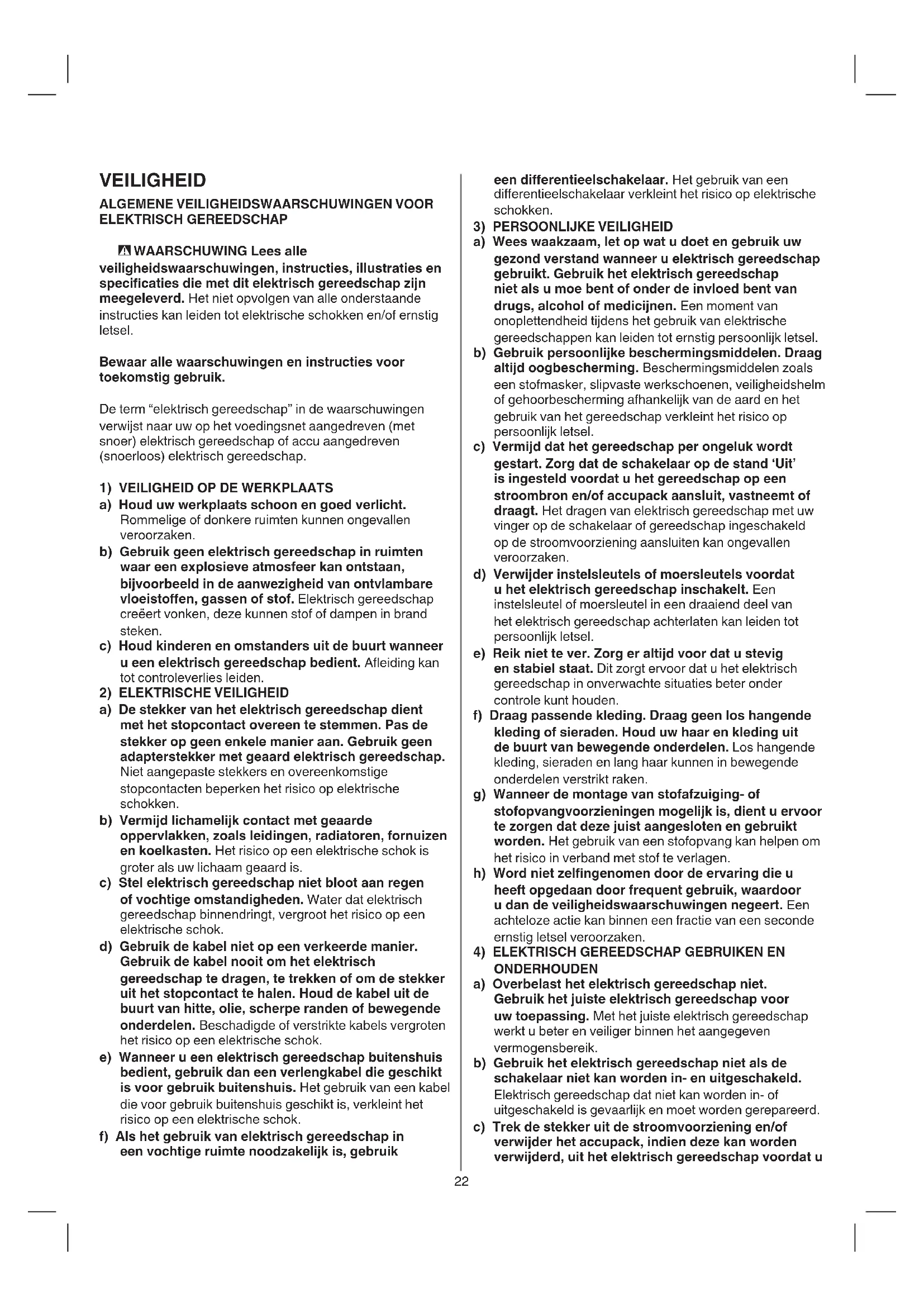 ELEKTRISCH GEREEDSCHAP - WAARSCHUWING Lees alle veiligheidswaarschuwingen, instructies, illustraties en specicaties die met dit elektrisch gereedschap zijn meegeleverd. Het niet opvolgen van alle onderstaande instructies kan leiden tot elektrische schokken en/of ernstig letsel. Bewaar alle waarschuwingen en instructies voor toekomstig gebruik. De term “elektrisch gereedschap” in de waarschuwingen verwijst naar uw op het voedingsnet aangedreven (met snoer) elektrisch gereedschap of accu aangedreven (snoerloos) elektrisch gereedschap.