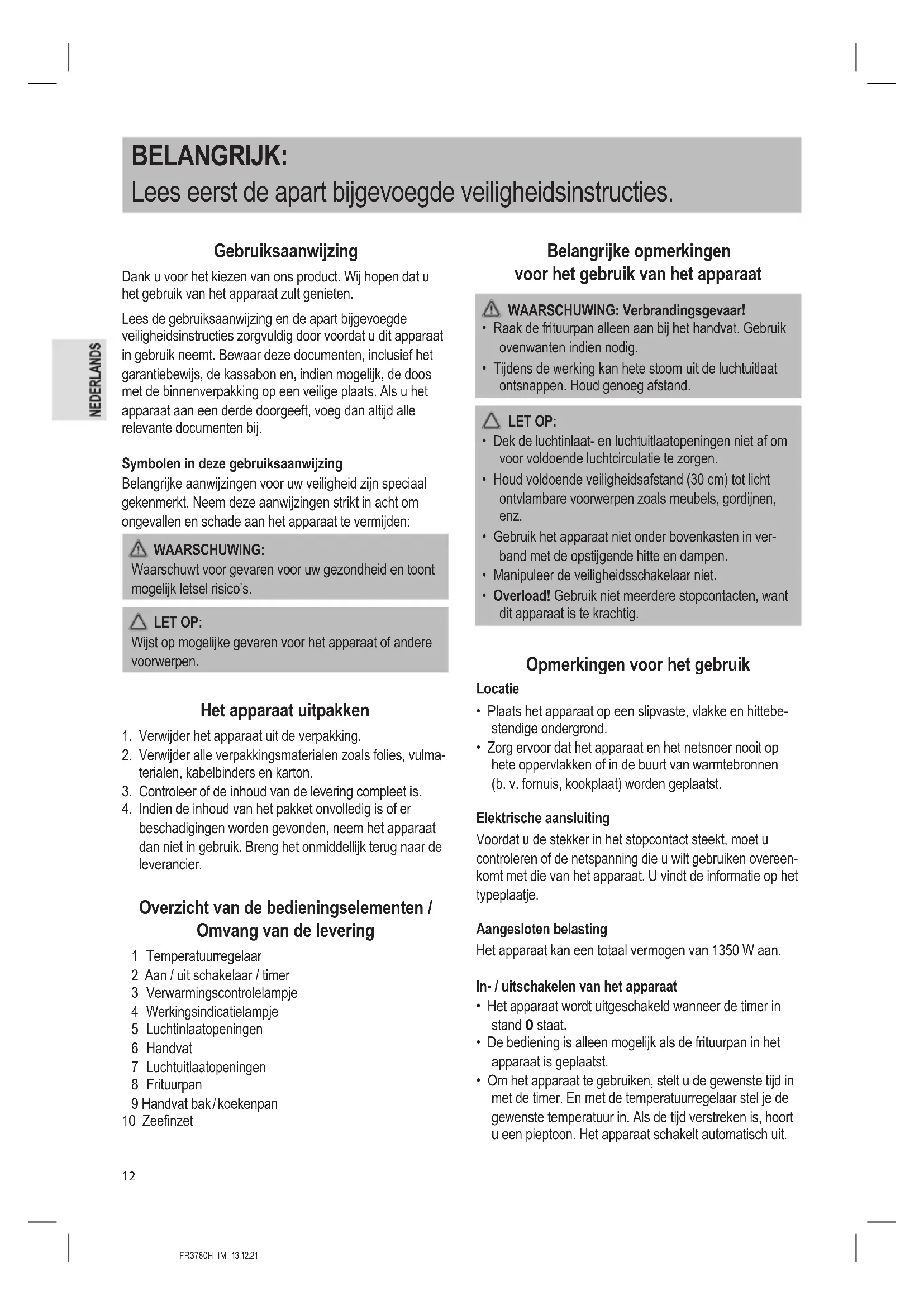 beschadigingen worden gevonden, neem het apparaat dan niet in gebruik. Breng het onmiddellijk terug naar de leverancier. Overzicht van de bedieningselementen / Omvang van de levering 1 Temperatuurregelaar 2 Aan / uit schakelaar / timer 3 Verwarmingscontrolelampje 4 Werkingsindicatielampje 5 Luchtinlaatopeningen 6 Handvat 7 Luchtuitlaatopeningen 8 Frituurpan 9 Handvat bak / koekenpan 10 Zeenzet Belangrijke opmerkingen voor het gebruik van het apparaat WAARSCHUWING: Verbrandingsgevaar!