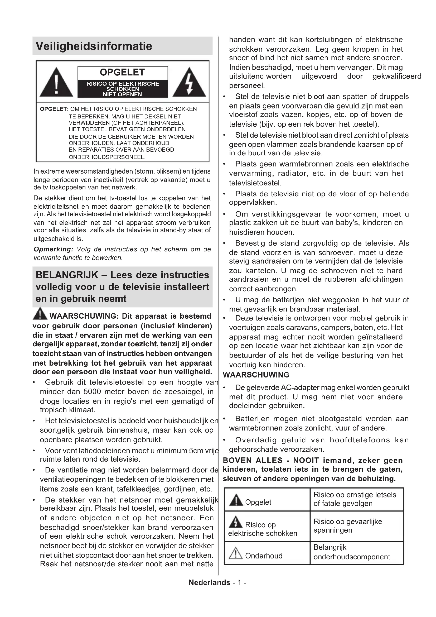 Bewaar nieuwe en oude batterijen uit de buurt van kinderen. Als het batterijcompartiment niet veilig afsluit, mag u het product niet blijven gebruiken en moet u het uit de buurt van kinderen bewaren. Als u denkt dat batterijen mogelijk werden ingeslikt of in een lichaamsdeel werd gestoken, moet u onmiddellijk medische zorg inroepen. – – – – – – – – – – – – Een televisie kan vallen en ernstig lichamelijk letsel of overlijden veroorzaken. Talrijke letsels, in het bij- zonder bij kinderen, kunnen worden vermeden door eenvoudige voorzorgsmaatregelen te nemen, zoals: Gebruik ALTIJD kasten of statieven of bevestigings- methoden die door de fabrikant van de televisieserie worden aanbevolen. Gebruik ALTIJD meubels die de TV-set veilig kunnen ondersteunen. Zorg er ALTIJD voor dat de televisie zich niet aan de rand van de ondersteunende meubelen overhangt. Leer kinderen ALTIJD over de gevaren van klimmen op meubels om de televisie of de bediening ervan te bereiken. Leid ALTIJD snoeren en kabels die op uw televisie zijn aangesloten, zodat ze niet kunnen worden om- gedraaid, getrokken of gepakt. Zet NOOIT een televisie op een instabiele locatie. Plaats de televisie NOOIT op hoog meubilair (bij- voorbeeld kasten of boekenkasten) zonder dat zowel het meubel als de televisie op een geschikte drager is verankerd. Plaats de televisie NOOIT op een doek of ander materiaal dat zich tussen de televisie set en de ondersteunende meubelen bevindt. Plaats NOOIT items die kinderen kunnen verleiden om te klimmen, zoals speelgoed en afstandsbedie- ningen, op de top van de televisie of meubels waarop de televisie is geplaatst. Het apparaat is enkel geschikt voor een montage op