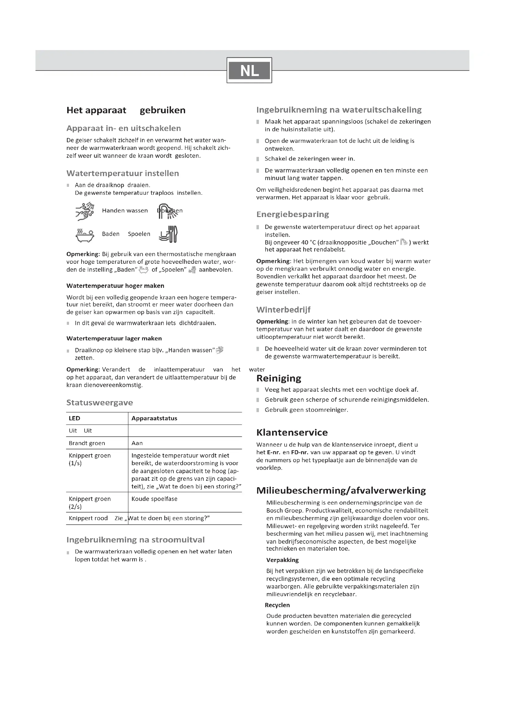 Oudeproductenbevattenmaterialendiegerecycled kunnenworden.Decomponentenkunnengemakkelijk wordengescheidenenkunststoffenzijngemarkeerd. LED Apparaatstatus Uit Uit Brandtgroen Aan Knippertgroen (1/s) Ingesteldetemperatuurwordtniet bereikt,dewaterdoorstromingisvoor deaangeslotencapaciteittehoog(ap‐ paraatzitopdegrensvanzijncapaci‐ teit),zie„Wattedoenbijeenstoring?” Knippertgroen (2/s) Koudespoelfase Knippertrood Zie„Wattedoenbijeenstoring?”NL Daardoorkunnenzewordengesorteerdenvoor recyclingofafvalverwerkingwordenafgegeven. Afgedankte elektrische en elektronische apparaten Nietmeertegebruikenelektrischeen elektronischeapparatenmoetengescheiden wordeningezameldenaaneen milieuvriendelijkeafvalverwerkingworden aangeboden(Europeserichtlijnbetreffende elektrischeenelektronischeafgedankte apparaten). Gebruikvoorhetafvoerenvanelektrischeen elektronischeafgedankteapparatende nationaleretour‐eninleversystemen. Batterijenmogennietmethet huishoudelijkafvalwordenafgevoerd.Lege batterijenmoetenviadevoorgeschreven inzamelingssystemenwordenafgevoerd. Wijzigingenvoorbehouden.NL Wattedoenbijeenstoring? Letop! Reparatiesmogenuitsluitendwordenuitgevoerddooreeninstallateur.Uloopteengrootrisicoindienhetappa‐ raatopondeskundigewijzewordtgerepareerd. Alsuwapparaatnietwerktzoalsgewenst,ligtditvaakslechtsaaneenkleinigheid.Controleerofumetdevolgendeaanwijzin‐ gendestoringzelfkuntverhelpen.Uvermijdtdaardoordekostenvooronnodigewerkzaamhedenvandeklantenservice. Deklantverhelptdestoringzelf Storing Oorzaak Oplossing Onvoldoende waterdoorstroming Dezeefindewaterkraanofindedouche‐ kopisverstopt. Verwijderdezeefenreinigofontkalkdeze. Deingesteldehogewatertem‐ peratuurwordtnietbereikt. Dedoorstroomgeiserisopeenthermo‐ staatmengkraanaangesloten. Detemperatuuropdegeiserop„Spoelen”