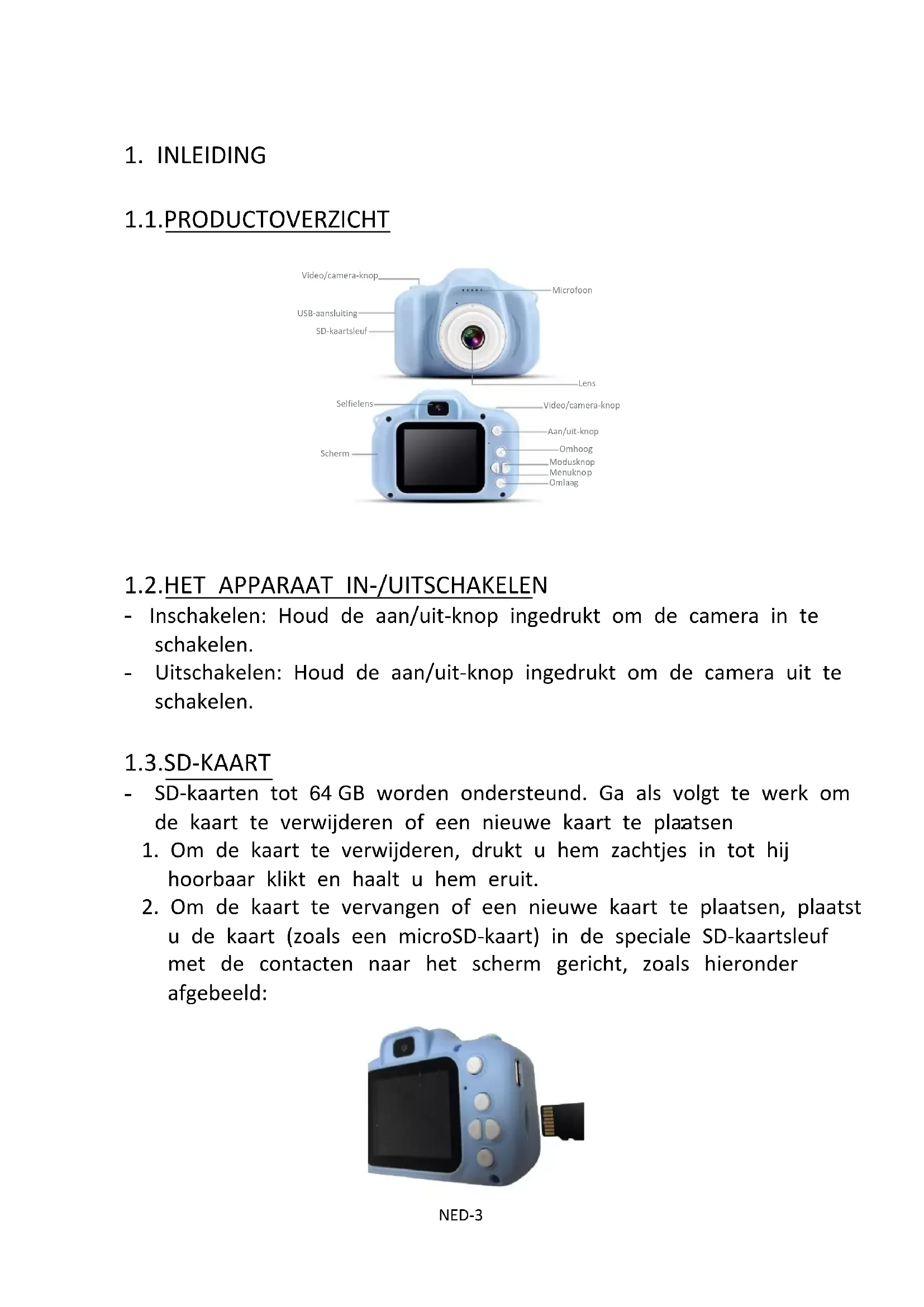 Er bevint zich een klein gat onder de USB-poort. Zorg ervoor dat de camera it uitgeschakeld en gebruik iets puntigs om in het kleine gat te steken. De camera wordt vervolgens gereset. Zie onderstaande afbeelding:NED-7 10.SPECIFICATIES Luidspreker Batterij Resolutie Videoresolutie Fotoresolutie Schermgrootte Materiaal Opslagmedia Geheugen Systeemvereisten 1 W 600 mah (volledige capaciteit met beschermplaat) 1080p/720p/VGA Werkelijk: 640x480 (VGA) Interpolatie: 1920x1080 Werkelijk: 640x480 Interpolatie: 40 MP