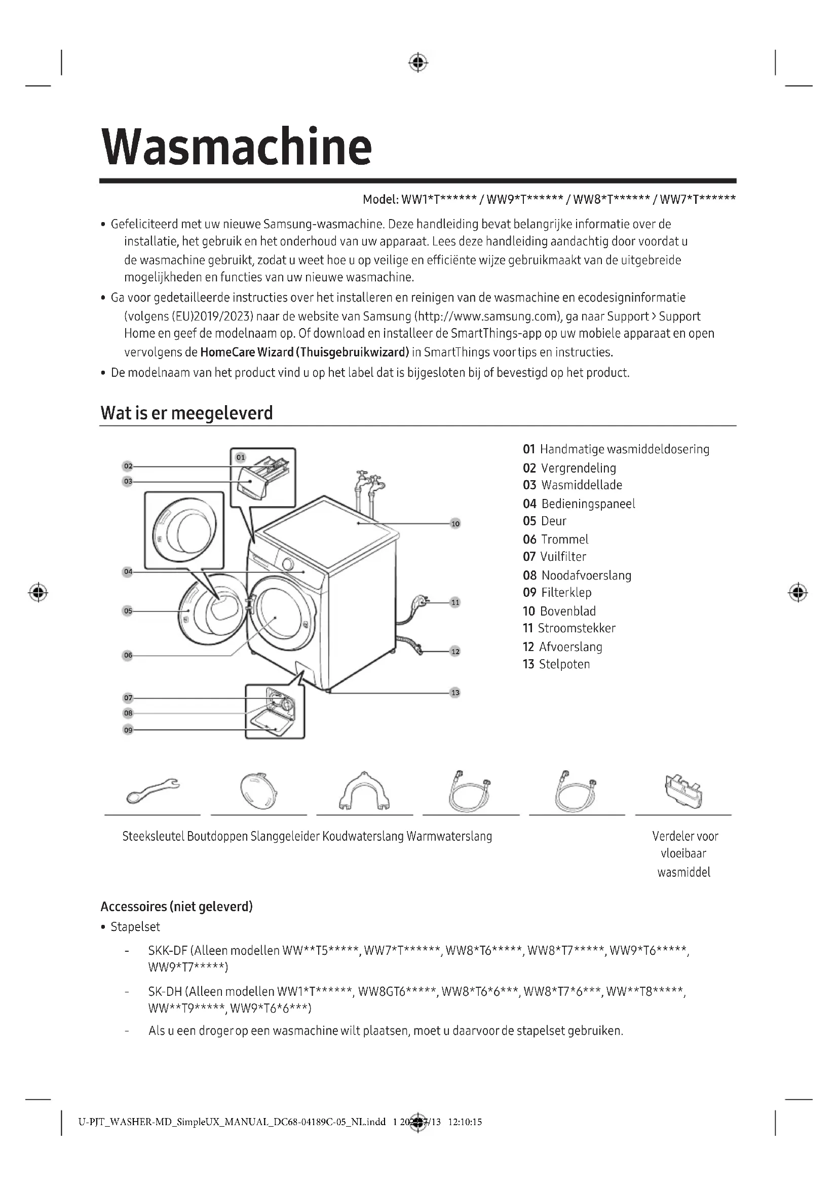 - Stapelset ‐ SKK-DF (Alleen modellen WW**T5*****, WW7*T******, WW8*T6*****, WW8*T7*****, WW9*T6*****, WW9*T7*****) ‐ SK-DH (Alleen modellen WW1*T******, WW8GT6*****, WW8*T6*6***, WW8*T7*6***, WW**T8*****, WW**T9*****, WW9*T6*6***) ‐ Als u een droger op een wasmachine wilt plaatsen, moet u daarvoor de stapelset gebruiken. U-PJT_WASHER-MD_SimpleUX_MANUAL_DC68-04189C-05_NL.indd 1 2022/7/13 12:10:15Nederlands2 Veiligheidsinformatie OPMERKING
