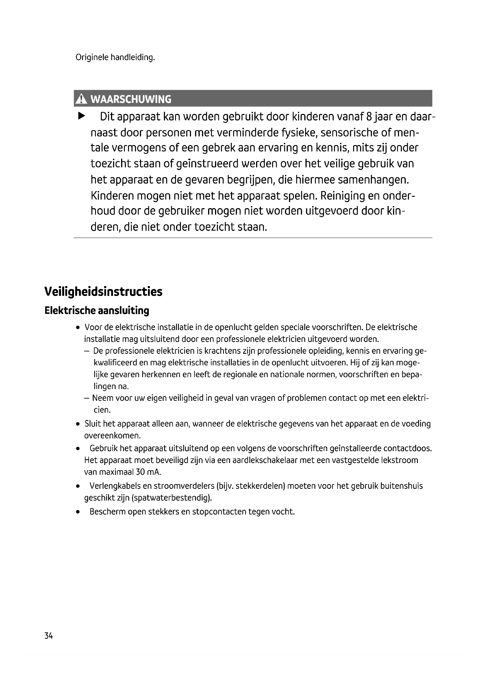 WAARSCHUWING WAARSCHUWING Dit apparaat kan worden gebruikt door kinderen vanaf 8 jaar en daar- naast door personen met verminderde fysieke, sensorische of men- tale vermogens of een gebrek aan ervaring en kennis, mits zij onder toezicht staan of geïnstrueerd werden over het veilige gebruik van het apparaat en de gevaren begrijpen, die hiermee samenhangen. Kinderen mogen niet met het apparaat spelen. Reiniging en onder- houd door de gebruiker mogen niet worden uitgevoerd door kin- deren, die niet onder toezicht staan. Veiligheidsinstructies Elektrische aansluiting Voor de elektrische installatie in de openlucht gelden speciale voorschriften. De elektrische installatie mag uitsluitend door een professionele elektricien uitgevoerd worden. – De professionele elektricien is krachtens zijn professionele opleiding, kennis en ervaring ge- kwalificeerd en mag elektrische installaties in de openlucht uitvoeren. Hij of zij kan moge- lijke gevaren herkennen en leeft de regionale en nationale normen, voorschriften en bepa- lingen na. – Neem voor uw eigen veiligheid in geval van vragen of problemen contact op met een elektri- cien. Sluit het apparaat alleen aan, wanneer de elektrische gegevens van het apparaat en de voeding overeenkomen. Gebruik het apparaat uitsluitend op een volgens de voorschriften geïnstalleerde contactdoos. Het apparaat moet beveiligd zijn via een aardlekschakelaar met een vastgestelde lekstroom van maximaal 30 mA. Verlengkabels en stroomverdelers (bijv. stekkerdelen) moeten voor het gebruik buitenshuis geschikt zijn (spatwaterbestendig). Bescherm open stekkers en stopcontacten tegen vocht.NL