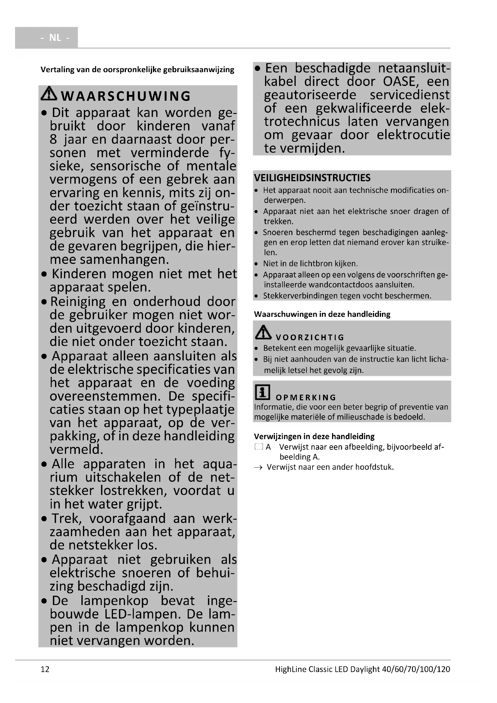 - Een beschadigde netaansluit- kabel direct door OASE, een geautoriseerde servicedienst of een gekwalificeerde elek- trotechnicus laten vervangen om gevaar door elektrocutie te vermijden. VEILIGHEIDSINSTRUCTIES