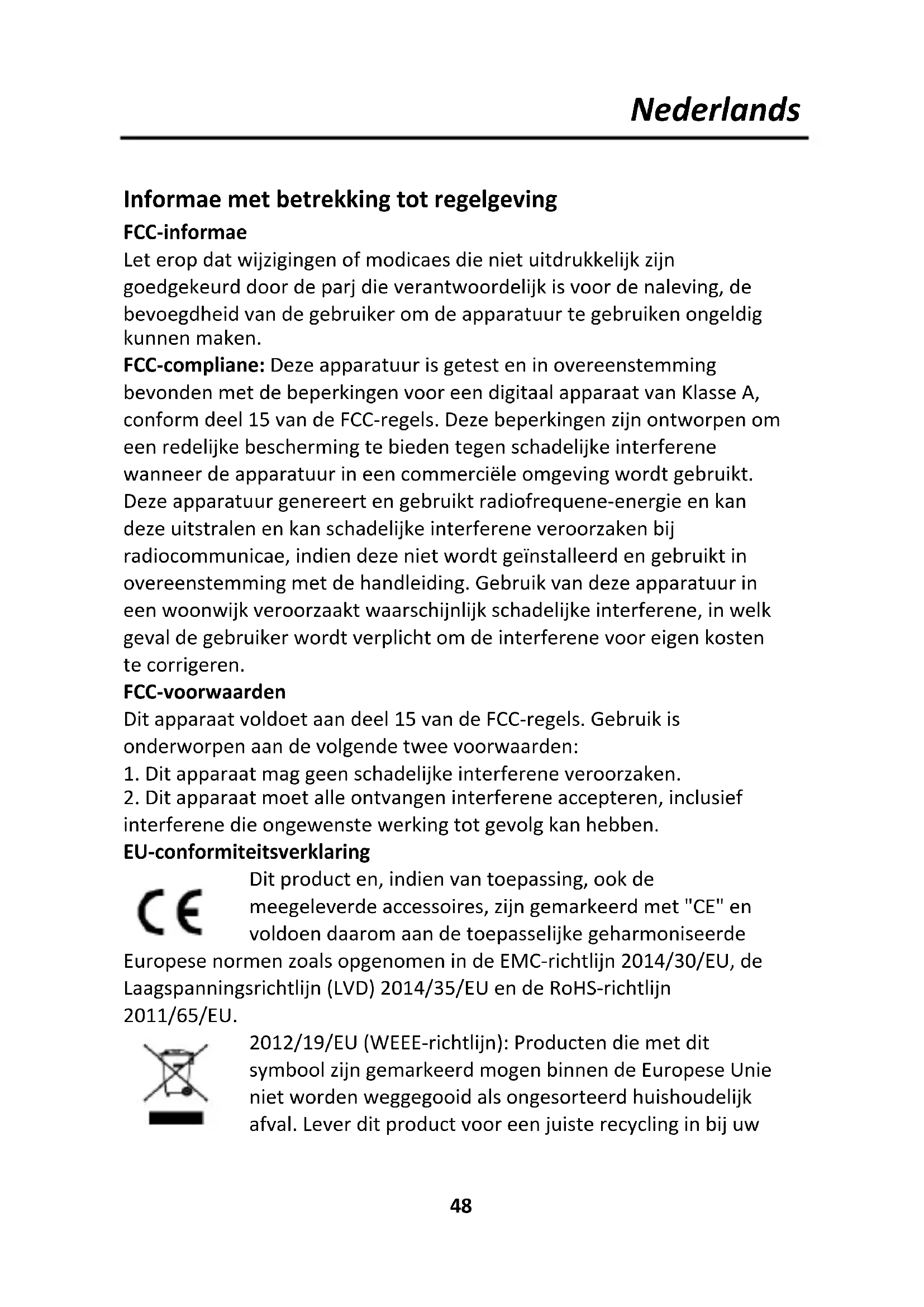 interferentie die ongewenste werking tot gevolg kan hebben. EU-conformiteitsverklaring Dit product en, indien van toepassing, ook de meegeleverde accessoires, zijn gemarkeerd met "CE" en voldoen daarom aan de toepasselijke geharmoniseerde Europese normen zoals opgenomen in de EMC-richtlijn 2014/30/EU, de Laagspanningsrichtlijn (LVD) 2014/35/EU en de RoHS-richtlijn 2011/65/EU. 2012/19/EU (WEEE-richtlijn): Producten die met dit symbool zijn gemarkeerd mogen binnen de Europese Unie niet worden weggegooid als ongesorteerd huishoudelijk afval. Lever dit product voor een juiste recycling in bij uwNederlands