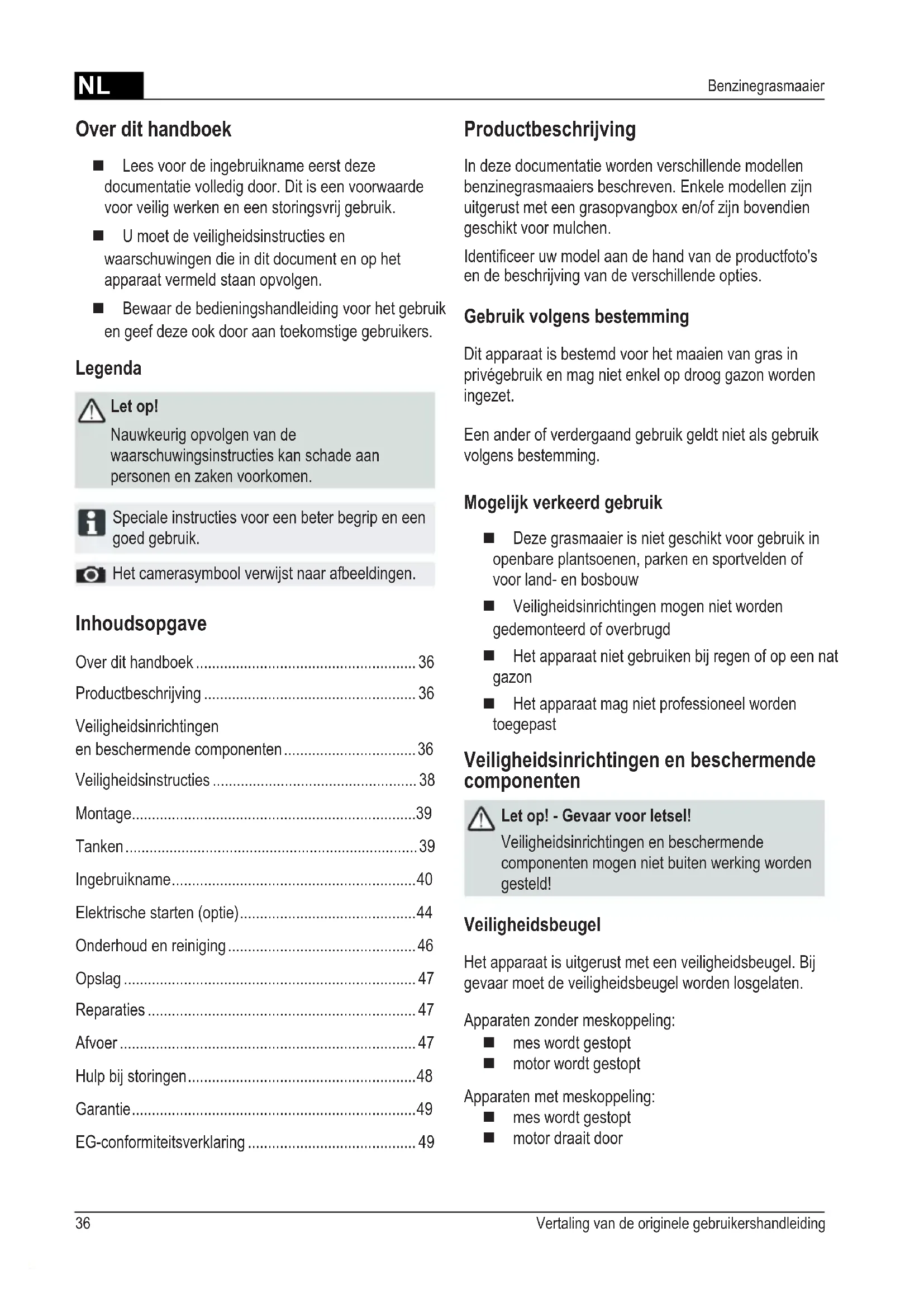 - Benzinegrasmaaier Inhoudsopgave Over dit handboek p. 36