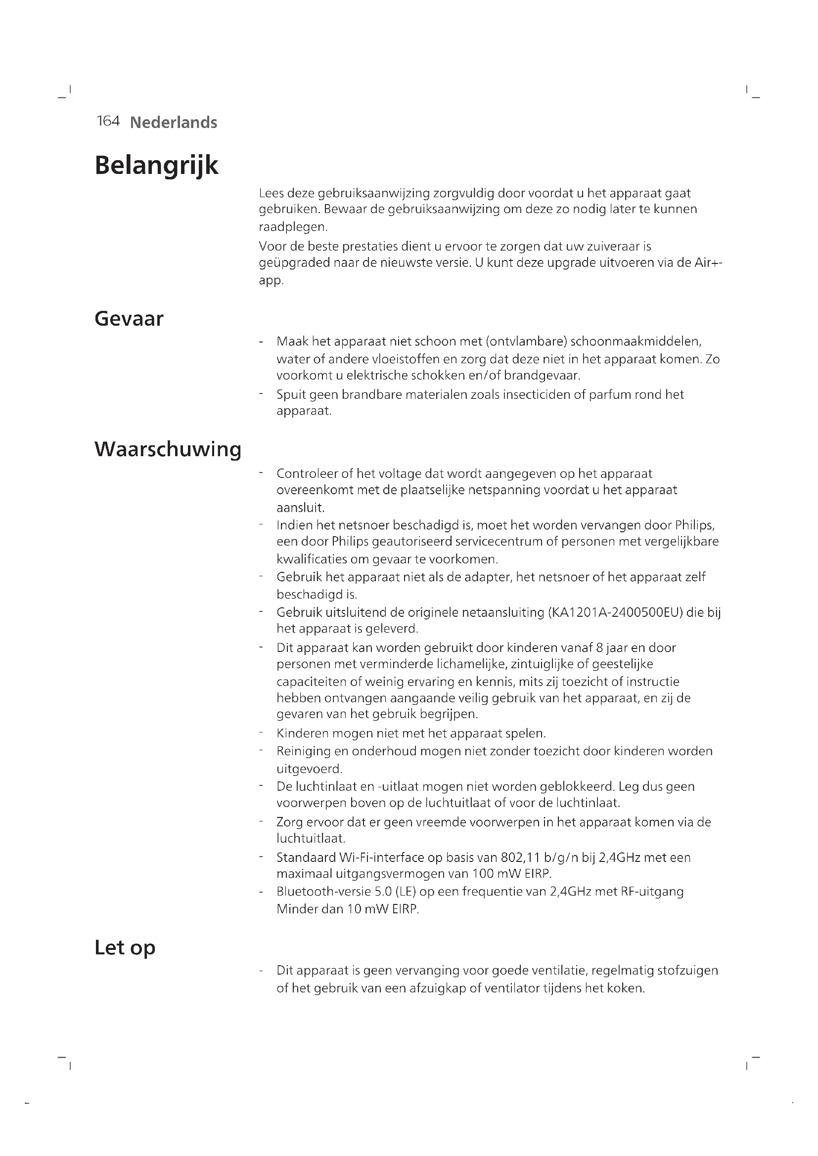 Nederlands Belangrijk Lees deze gebruiksaanwijzing zorgvuldig door voordat u het apparaat gaat gebruiken. Bewaar de gebruiksaanwijzing om deze zo nodig later te kunnen raadplegen. Voor de beste prestaties dient u ervoor te zorgen dat uw zuiveraar is geüpgraded naar de nieuwste versie. U kunt deze upgrade uitvoeren via de Air+- app. Gevaar