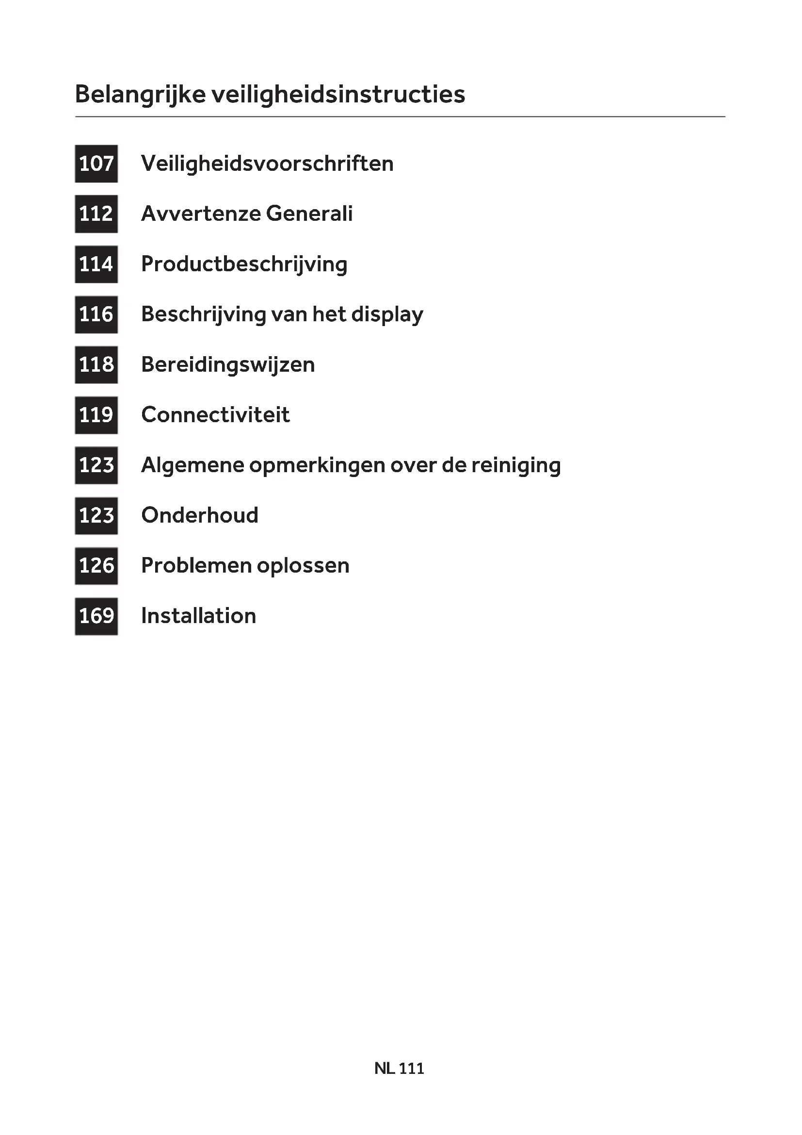 Veiligheidsvoorschriften Avvertenze Generali Productbeschrijving Beschrijving van het display Bereidingswijzen Connectiviteit Algemene opmerkingen over de reiniging Onderhoud Problemen oplossen Installation Belangrijke veiligheidsinstructies