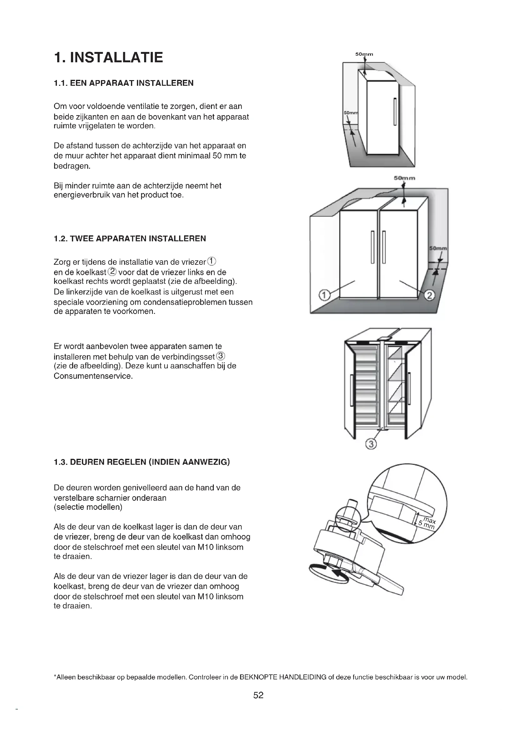(ziedeafbeelding).Dezekuntuaanschaffenbijde Consumentenservice. 1.3. DEUREN REGELEN (INDIEN AANWEZIG) De deuren worden genivelleerd aan de hand van de verstelbare scharnier onderaan (selectiemodellen) Als de deur van de koelkast lager is dan de deur van devriezer,brengdedeurvandekoelkastdanomhoog doordestelschroefmeteensleutelvanM10linksom tedraaien. Als de deur van de vriezer lager is dan de deur van de koelkast,brengdedeurvandevriezerdanomhoog doordestelschroefmeteensleutelvanM10linksom tedraaien. *Alleenbeschikbaaropbepaaldemodellen.ControleerindeBEKNOPTEHANDLEIDINGofdezefunctiebeschikbaarisvooruwmodel. 50mm 50mm 5 mm max53