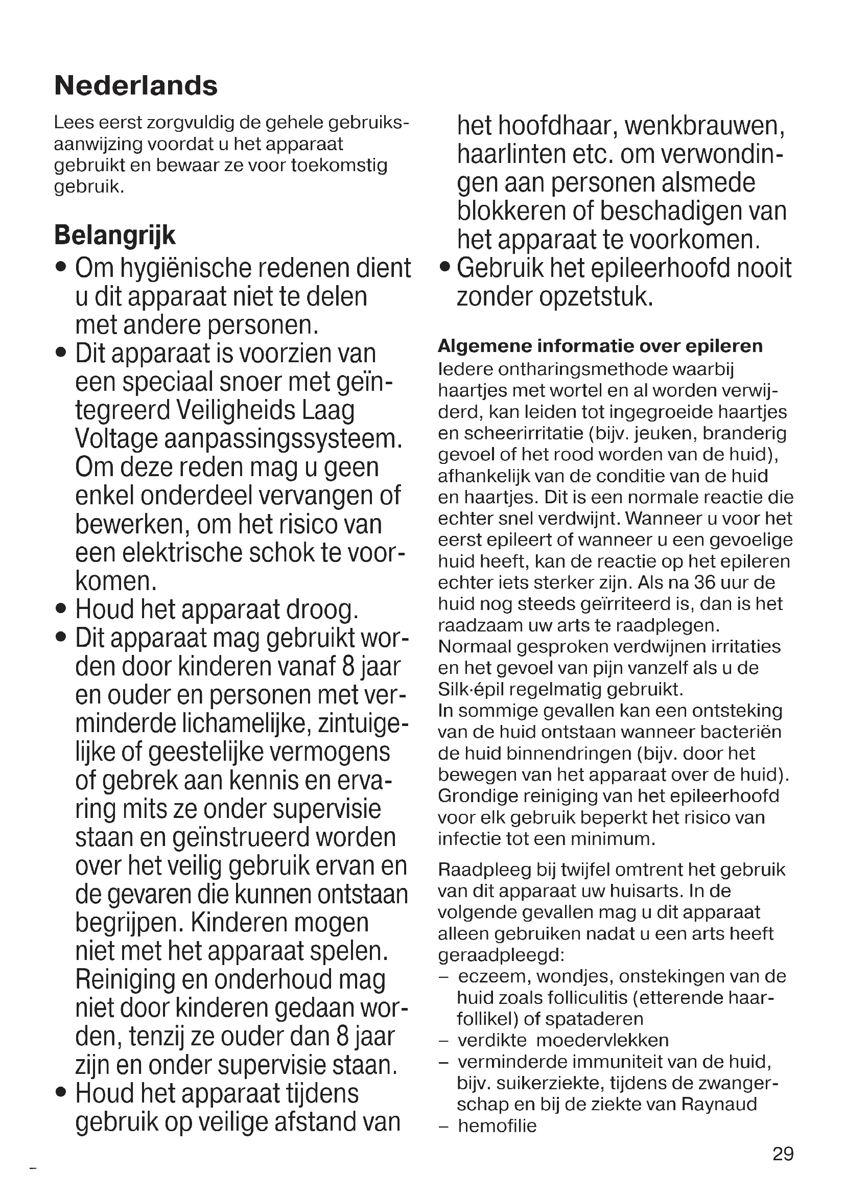 Gebruik het epileerhoofd nooit zonder opzetstuk. Algemene informatie over epileren Iedere ontharingsmethode waarbij haartjes met wortel en al worden verwij- derd, kan leiden tot ingegroeide haartjes en scheerirritatie (bijv. jeuken, branderig gevoel of het rood worden van de huid), afhankelijk van de conditie van de huid en haartjes. Dit is een normale reactie die echter snel verdwijnt. Wanneer u voor het eerst epileert of wanneer u een gevoelige huid heeft, kan de reactie op het epileren echter iets sterker zijn. Als na 36 uur de huid nog steeds geïrriteerd is, dan is het raadzaam uw arts te raadplegen. Normaal gesproken verdwijnen irritaties en het gevoel van pijn vanzelf als u de Silk·épil regelmatig gebruikt. In sommige gevallen kan een ontsteking van de huid ontstaan wanneer bacteriën de huid binnendringen (bijv. door het bewegen van het apparaat over de huid). Grondige reiniging van het epileerhoofd voor elk gebruik beperkt het risico van infectie tot een minimum. Raadpleeg bij twijfel omtrent het gebruik van dit apparaat uw huisarts. In de volgende gevallen mag u dit apparaat alleen gebruiken nadat u een arts heeft geraadpleegd: – eczeem, wondjes, onstekingen van de huid zoals folliculitis (etterende haar- follikel) of spataderen – verdikte moedervlekken – verminderde immuniteit van de huid, bijv. suikerziekte, tijdens de zwanger- schap en bij de ziekte van Raynaud – hemofilie Nederlands 91618385_SE_3273_3274_GROCERY_S6-60.indd 2991618385_SE_3273_3274_GROCERY_S6-60.indd 29 22.08.17 08:3022.08.17 08:30 CSS APPROVED Effective Date 25Aug2017 GMT - Printed 22Nov2017 Page 29 of 6030 Epileren gaat makkelijker en voelt pret- tiger aan wanneer de haartjes tussen 2 en 5 mm lang zijn. Indien de haartjes langer zijn is het aan te raden deze eerst op deze lengte af te scheren (zie hoofd- stuk B). Het kan voorkomen dat teruggroeiende fijne haartjes niet door de huidopper- vlakte kunnen komen. Om het risico van ingroeiende haartjes te voorkomen, is het raadzaam om regelmatig een mas- sage spons of huidpeeling te gebruiken (bijv. na het douchen). Door een zachte scrubbeweging wordt de bovenste huid- laag verwijderd en kunnen fijne haartjes door de huidoppervlakte groeien. Beschrijving 1 Massagerollers opzetstuk 2 Epileerhoofd met pincetjes element 3 Knopjes voor het verwisselen van de epileerhoofden 4 Aan/uit knop met lichtje 5 Snoeringang apparaat 6 Stekkeraansluiting 7 Scheerhoofd met trimkapje A Hoe u moet epileren