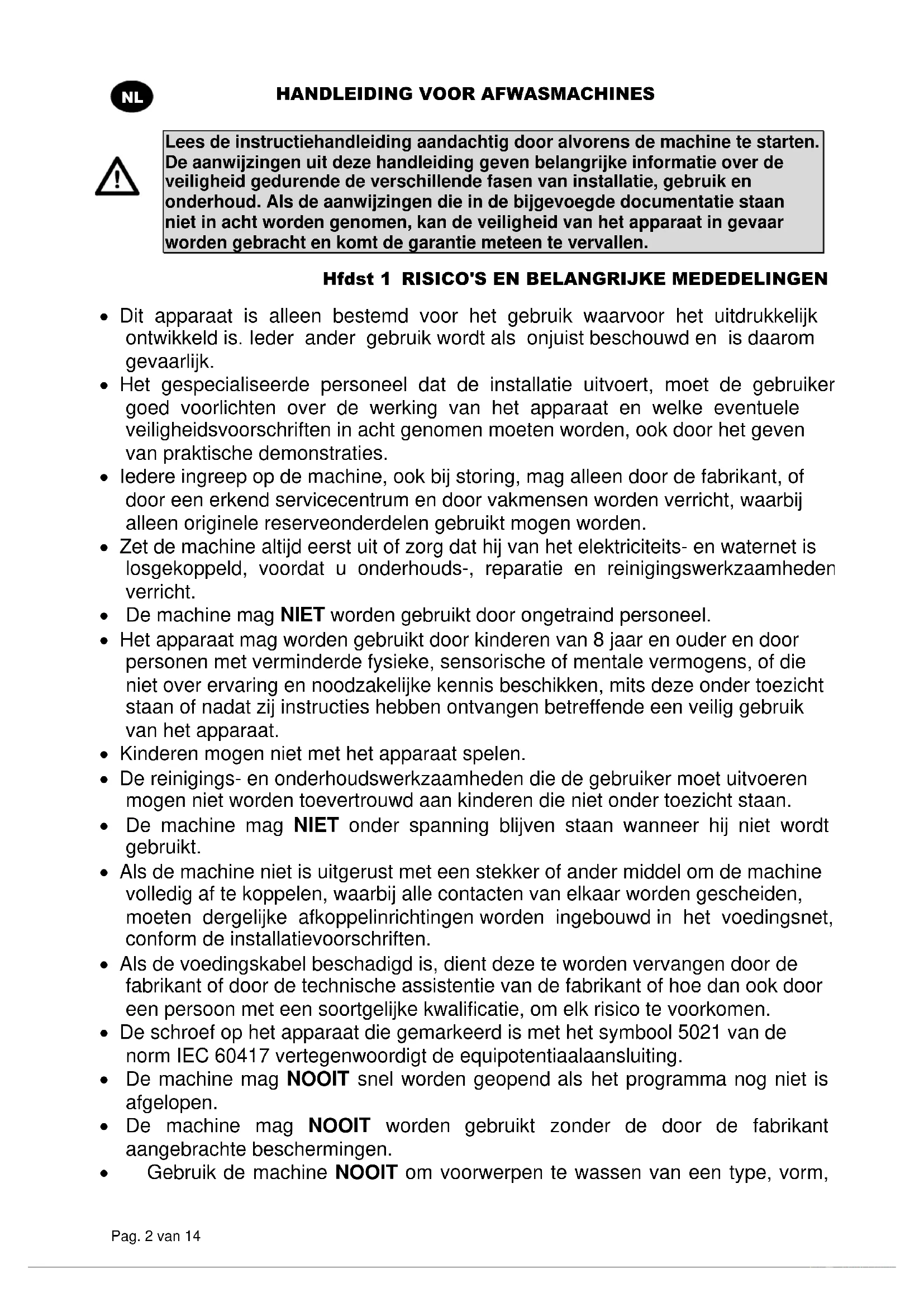 Lees de instructiehandleiding aandachtig door alvorens de machine te starten. De aanwijzingen uit deze handleiding geven belangrijke informatie over de veiligheid gedurende de verschillende fasen van installatie, gebruik en onderhoud. Als de aanwijzingen die in de bijgevoegde documentatie staan niet in acht worden genomen, kan de veiligheid van het apparaat in gevaar worden gebracht en komt de garantie meteen te vervallen. Hfdst 1 RISICO'S EN BELANGRIJKE MEDEDELINGEN Dit apparaat is alleen bestemd voor het gebruik waarvoor het uitdrukkelijk ontwikkeld is. Ieder ander gebruik wordt als onjuist beschouwd en is daarom gevaarlijk. Het gespecialiseerde personeel dat de installatie uitvoert, moet de gebruiker goed voorlichten over de werking van het apparaat en welke eventuele veiligheidsvoorschriften in acht genomen moeten worden, ook door het geven van praktische demonstraties. Iedere ingreep op de machine, ook bij storing, mag alleen door de fabrikant, of door een erkend servicecentrum en door vakmensen worden verricht, waarbij alleen originele reserveonderdelen gebruikt mogen worden. Zet de machine altijd eerst uit of zorg dat hij van het elektriciteits- en waternet is losgekoppeld, voordat u onderhouds-, reparatie en reinigingswerkzaamheden verricht. De machine mag NIET worden gebruikt door ongetraind personeel. Het apparaat mag worden gebruikt door kinderen van 8 jaar en ouder en door personen met verminderde fysieke, sensorische of mentale vermogens, of die niet over ervaring en noodzakelijke kennis beschikken, mits deze onder toezicht staan of nadat zij instructies hebben ontvangen betreffende een veilig gebruik van het apparaat. Kinderen mogen niet met het apparaat spelen. De reinigings- en onderhoudswerkzaamheden die de gebruiker moet uitvoeren mogen niet worden toevertrouwd aan kinderen die niet onder toezicht staan. De machine mag NIET onder spanning blijven staan wanneer hij niet wordt gebruikt. Als de machine niet is uitgerust met een stekker of ander middel om de machine volledig af te koppelen, waarbij alle contacten van elkaar worden gescheiden, moeten dergelijke afkoppelinrichtingen worden ingebouwd in het voedingsnet, conform de installatievoorschriften. Als de voedingskabel beschadigd is, dient deze te worden vervangen door de fabrikant of door de technische assistentie van de fabrikant of hoe dan ook door een persoon met een soortgelijke kwalificatie, om elk risico te voorkomen. De schroef op het apparaat die gemarkeerd is met het symbool 5021 van de norm IEC 60417 vertegenwoordigt de equipotentiaalaansluiting. De machine mag NOOIT snel worden geopend als het programma nog niet is afgelopen. De machine mag NOOIT worden gebruikt zonder de door de fabrikant aangebrachte beschermingen. Gebruik de machine NOOIT om voorwerpen te wassen van een type, vorm,HANDLEIDING VOOR AFWASMACHINES Pag. 3 van 14