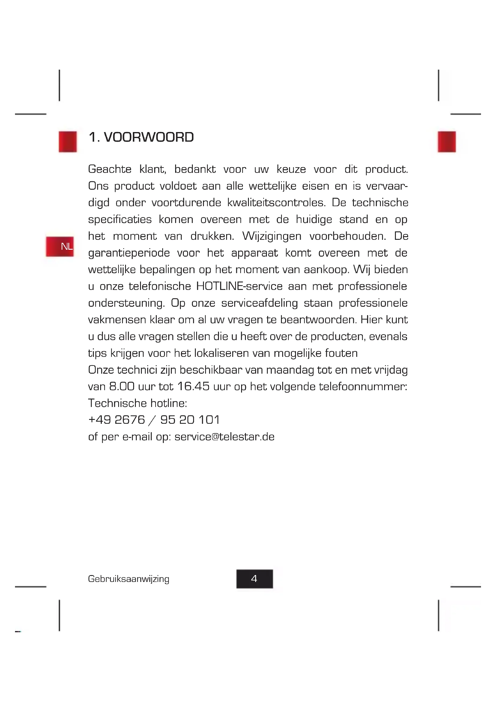 Geachte klant, bedankt voor uw keuze voor dit product. Ons product voldoet aan alle wettelijkke eisen en is vervaardigd onder voortdurende kwaliteitstcontroles. De technische specificaties komen overeen met de huidige stand en op het moment van drukken. Wijzigingen voorbehouden. De garantieperiode voor het apparaat komt overeen met de wettelijkke bepalingen op het moment van aankoop. Wij biedenu once Telefonische HOTLINE-service aan met professionele ondersteuning. Op once serviceafdeling staan professionelevakmensen maar om al uw vragen te beantwoorden. Hier kurz u dus alle vragen stellen die u heeft over de producten, evenals tips krijgen voor het lokaliseren van möglichke fouten