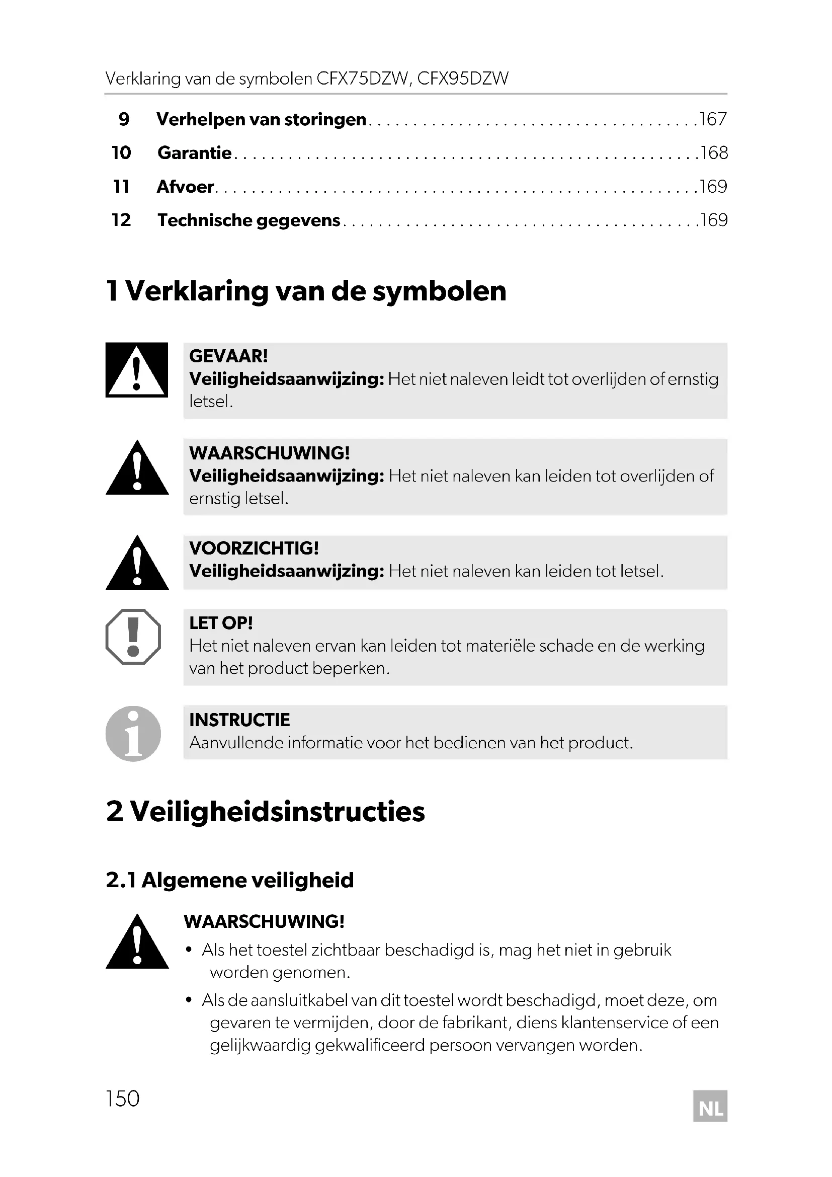 - Als de aansluitkabel van dit toestel wordt beschadigd, moet deze, om gevaren te vermijden, door de fabrikant, diens klantenservice of een gelijkwaardig gekwalificeerd persoon vervangen worden. GEVAAR! Veiligheidsaanwijzing: Het niet naleven leidt tot overlijden of ernstig letsel. WAARSCHUWING! Veiligheidsaanwijzing: Het niet naleven kan leiden tot overlijden of ernstig letsel. VOORZICHTIG! Veiligheidsaanwijzing: Het niet naleven kan leiden tot letsel. LET OP! Het niet naleven ervan kan leiden tot materiële schade en de werking van het product beperken. INSTRUCTIE Aanvullende informatie voor het bedienen van het product. CFX75_95DZW--O-16s.book Seite 150 Montag, 14. August 2017 4:29 16NL CFX75DZW, CFX95DZW Veiligheidsinstructies