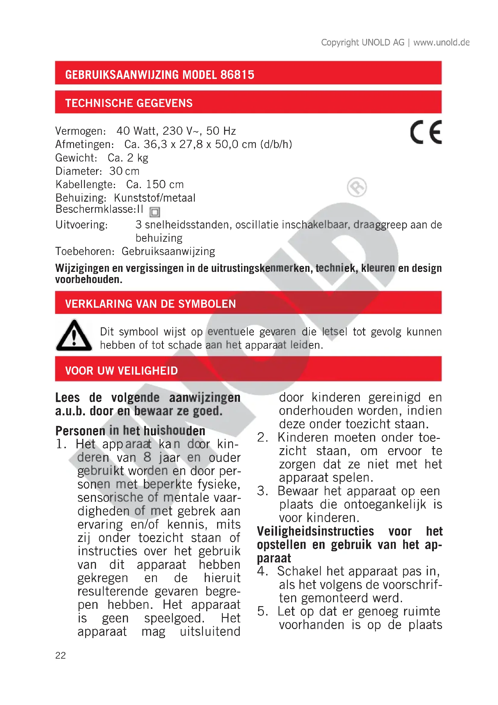 Dit symbool wijst op eventuele gevaren die letsel tot gevolg kunnen hebben of tot schade aan het apparaat leiden. Copyright UNOLD AG | www.unold.de23 waar het apparaat opgesteld is. Er moet minstens 50 cm afstand tussen het apparaat en andere voorwerpen aan- gehouden worden.