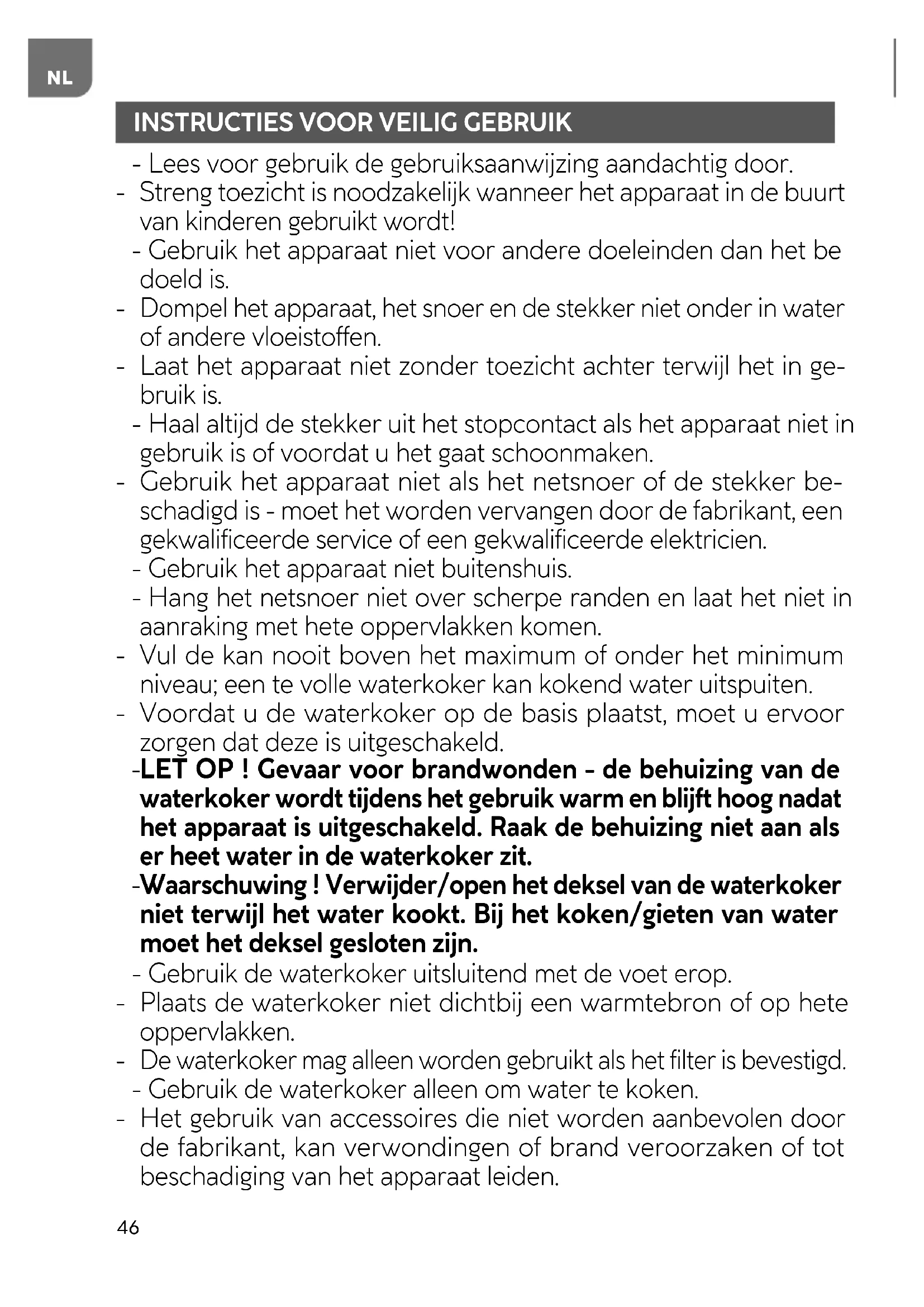 LET OP ! Risico op elektrische schokken - zorg ervoor dat u geen elektrische onderdelen van het apparaat aanraakt wan- neer u het bedient. Let vooral op de aansluiting van de kan en de voet ervan. Als er op elektrische onderdelen - is gespat, moet u deze grondig reinigen en drogen voordat u het apparaat weer gebruikt. - Laat de waterkoker niet draaien zonder water. - Het apparaat is niet bedoeld om met externe timers of een af