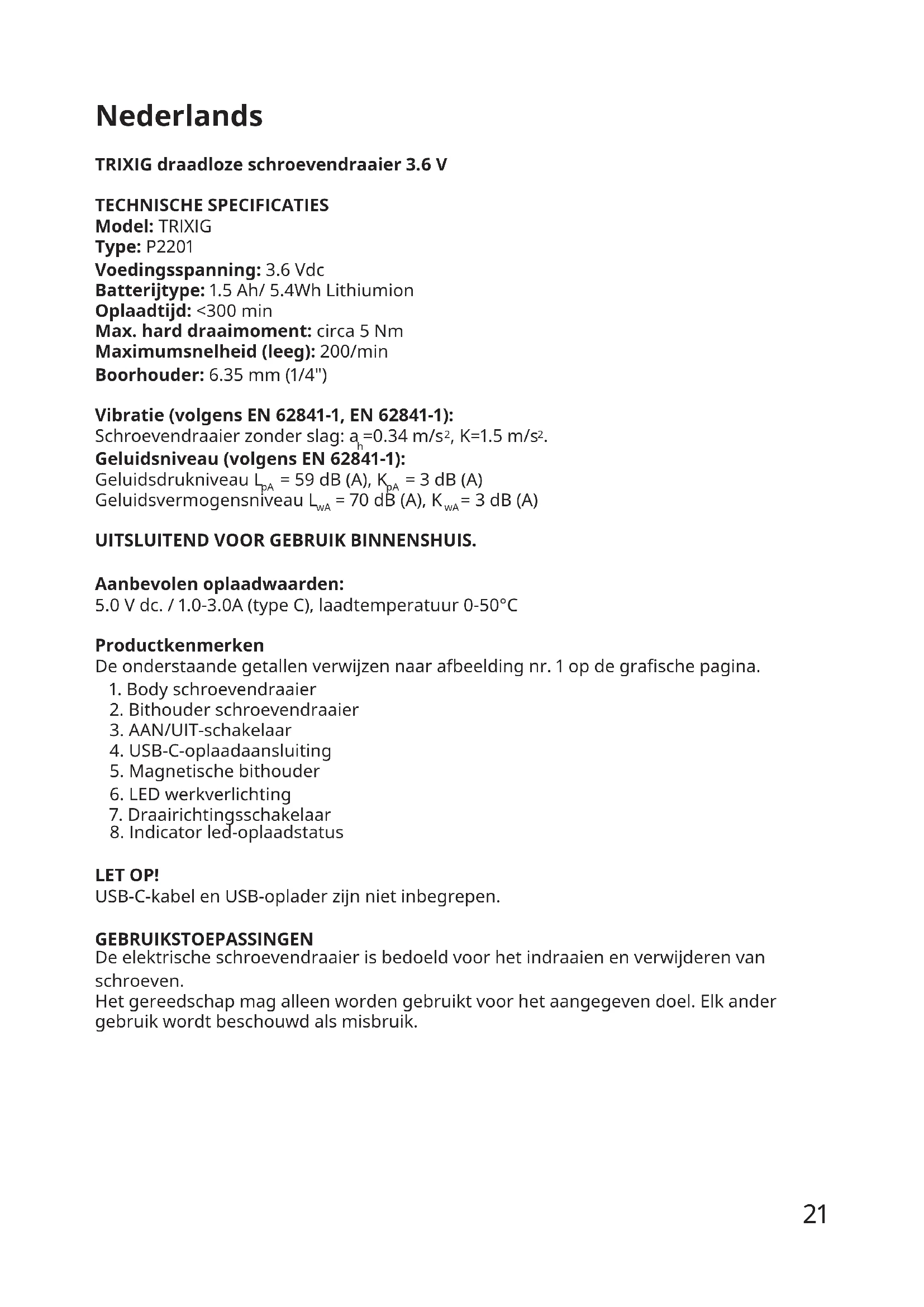 - gemarkeerd met: Cd = cadmium, Hg = kwik, Pb = lood Het symbool met de doorgestreepte vuilnisbak op wieltjes geeft aan dat het product gescheiden van het huishoudelijk afval moet worden aangeboden. Het product moet worden ingeleverd voor recycling in overeenstemming met de plaatselijke milieuvoorschriften voor afvalverwerking. Breng het naar de plaatselijke milieustraat of het dichtstbijzijnde IKEA woonwarenhuis. Door producten met dit symbool te scheiden van het huishoudelijk afval, help je de hoeveelheid afval naar verbrandingsovens of stortplaatsen te verminderen en eventuele negatieve invloeden op de volksgezondheid en het milieu te minimaliseren. Voor meer informatie neem contact op met IKEA.30 Dansk TRIXIG trådløs skuetrækker 3.6V TEKNISKE SPECIFIKATIONER Model: TRIXIG Type: P2201 Spænding: 3.6 Vdc. Batteritype: 1.5 Ah/ 5.4Wh lithium-ion Opladningstid: <300 min Maks. drejningsmoment: ca. 5 Nm Maks. hastighed uden belastning: 200/min. Borholder: 6.35 mm (1/4”) Vibration (i henhold til EN 62841-1, EN 62841-2-2): Skruetrækker uden stødkraft: a