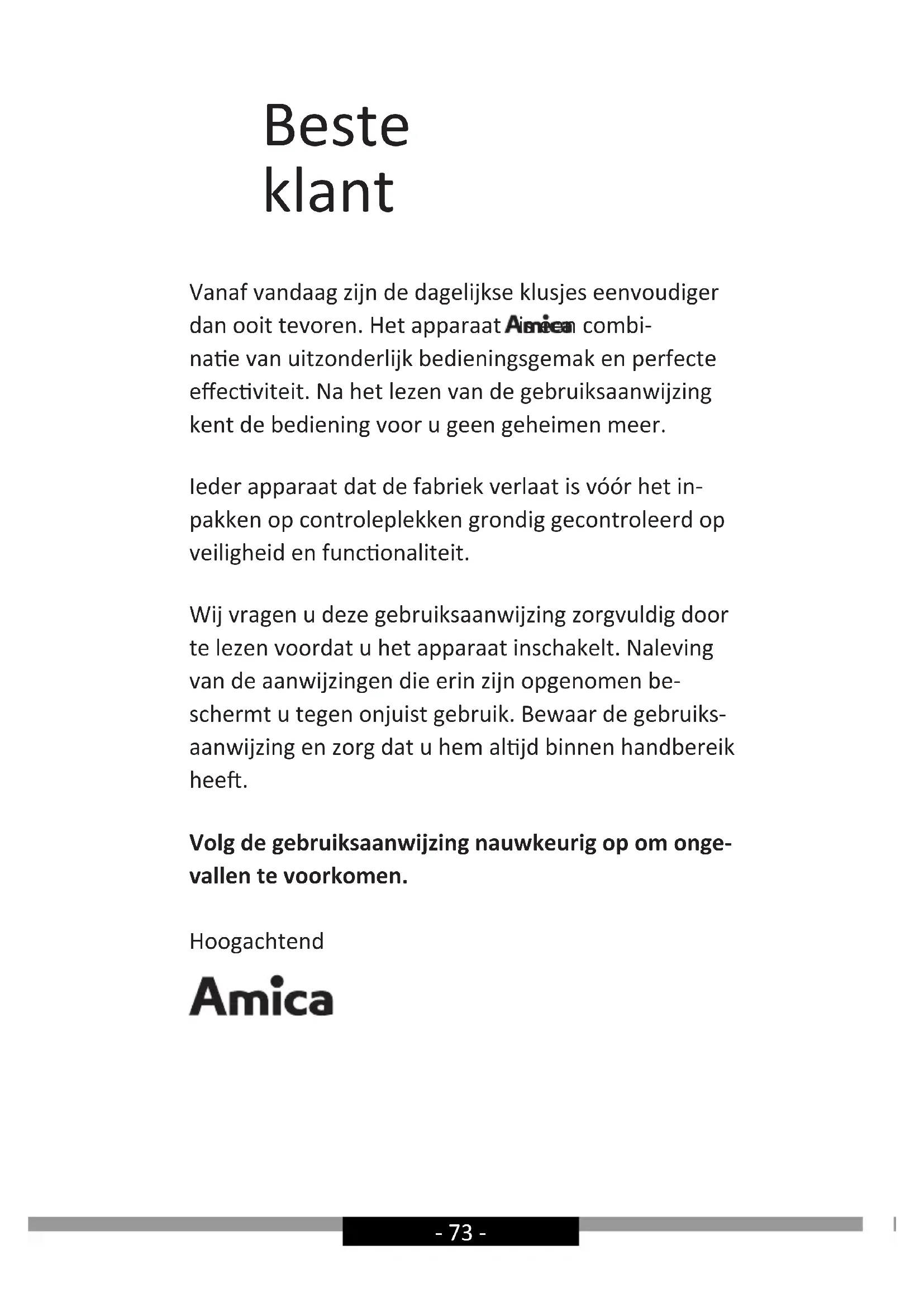 - directive RoHS 2011/65/CE et c’est le pourquoi le produit est désigné par le symbol ainsi qu’une déclaration de la conformité accessible aux organes chargés de la surveillance du marché a été délivrée.- 73 - Beste klant Vanaf vandaag zijn de dagelijkse klusjes eenvoudiger dan ooit tevoren. Het apparaat is een combi- nae van uitzonderlijk bedieningsgemak en perfecte eecviteit. Na het lezen van de gebruiksaanwijzing kent de bediening voor u geen geheimen meer. Ieder apparaat dat de fabriek verlaat is vóór het in- pakken op controleplekken grondig gecontroleerd op veiligheid en funconaliteit. Wij vragen u deze gebruiksaanwijzing zorgvuldig door te lezen voordat u het apparaat inschakelt. Naleving van de aanwijzingen die erin zijn opgenomen be- schermt u tegen onjuist gebruik. Bewaar de gebruiks- aanwijzing en zorg dat u hem aljd binnen handbereik hee. Volg de gebruiksaanwijzing nauwkeurig op om onge- vallen te voorkomen. Hoogachtend- 74 - AANWIJZINGEN BETREF-