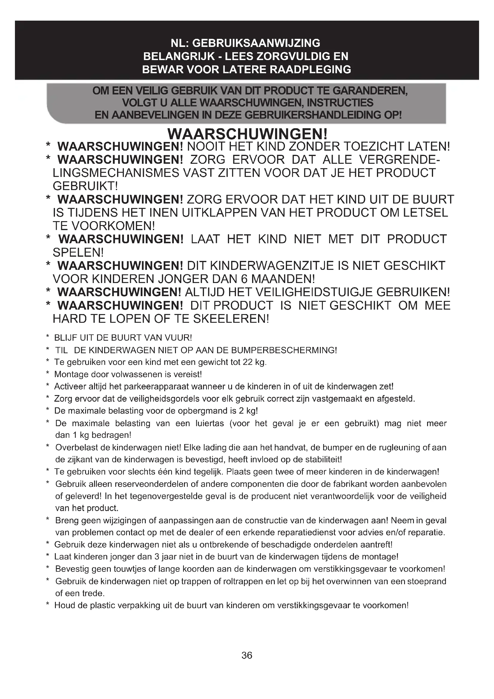 - Breng geen wijzigingen of aanpassingen aan de constructie van de kinderwagen aan! Neem in geval van problemen contact op met de dealer of een erkende reparatiedienst voor advies en/of reparatie.