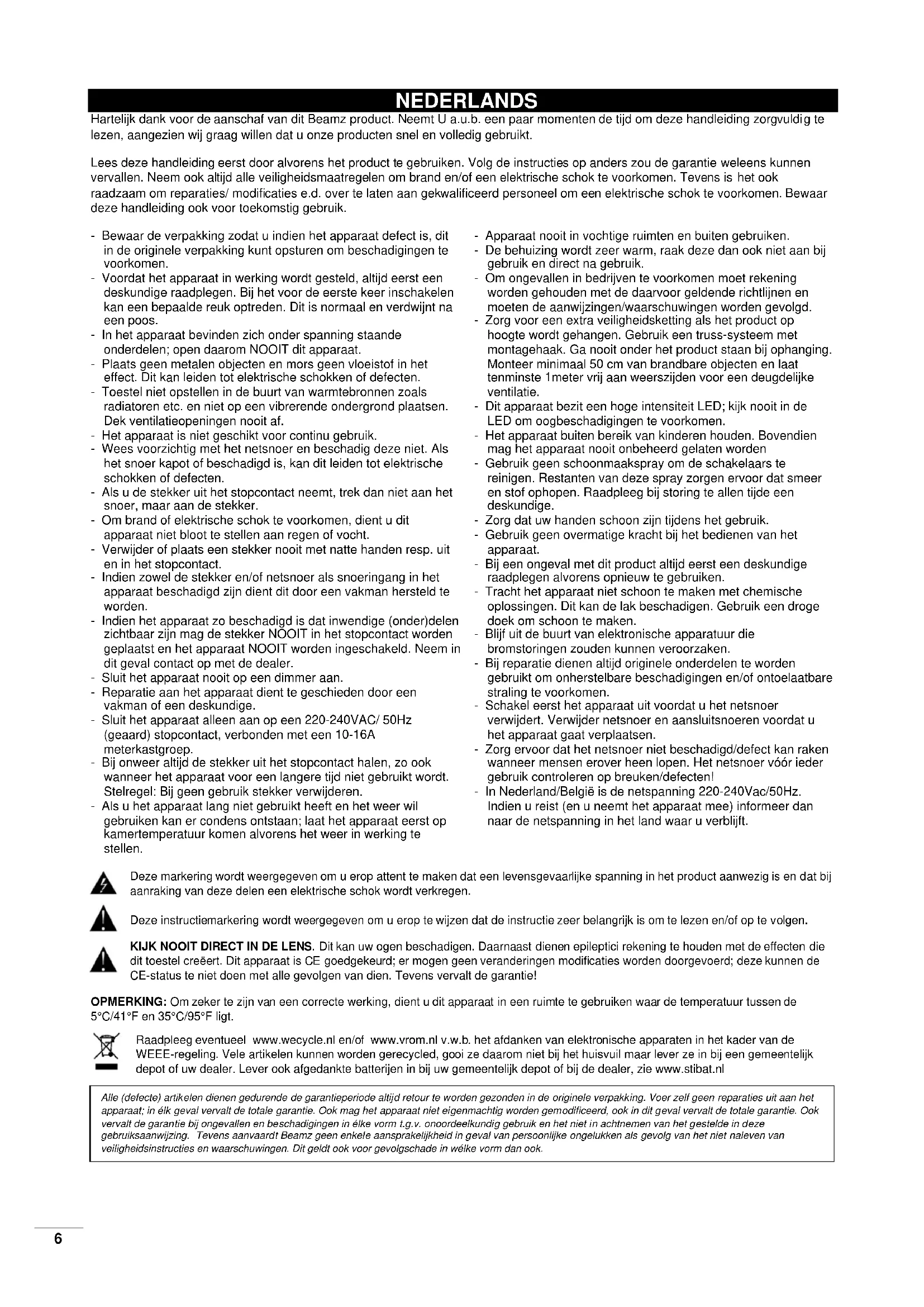 Run clean procedure in a well-ventilated area!6 NEDERLANDS Hartelijk dank voor de aanschaf van dit Beamz product. Neemt U a.u.b. een paar momenten de tijd om deze handleiding zorgvuldig te lezen, aangezien wij graag willen dat u onze producten snel en volledig gebruikt. Lees deze handleiding eerst door alvorens het product te gebruiken. Volg de instructies op anders zou de garantie weleens kunnen vervallen. Neem ook altijd alle veiligheidsmaatregelen om brand en/of een elektrische schok te voorkomen. Tevens is het ook raadzaam om reparaties/ modificaties e.d. over te laten aan gekwalificeerd personeel om een elektrische schok te voorkomen. Bewaar deze handleiding ook voor toekomstig gebruik. - Bewaar de verpakking zodat u indien het apparaat defect is, dit in de originele verpakking kunt opsturen om beschadigingen te voorkomen. - Voordat het apparaat in werking wordt gesteld, altijd eerst een deskundige raadplegen. Bij het voor de eerste keer inschakelen kan een bepaalde reuk optreden. Dit is normaal en verdwijnt na een poos. - In het apparaat bevinden zich onder spanning staande onderdelen; open daarom NOOIT dit apparaat. - Plaats geen metalen objecten en mors geen vloeistof in het effect. Dit kan leiden tot elektrische schokken of defecten. - Toestel niet opstellen in de buurt van warmtebronnen zoals radiatoren etc. en niet op een vibrerende ondergrond plaatsen. Dek ventilatieopeningen nooit af. - Het apparaat is niet geschikt voor continu gebruik. - Wees voorzichtig met het netsnoer en beschadig deze niet. Als het snoer kapot of beschadigd is, kan dit leiden tot elektrische schokken of defecten. - Als u de stekker uit het stopcontact neemt, trek dan niet aan het snoer, maar aan de stekker. - Om brand of elektrische schok te voorkomen, dient u dit apparaat niet bloot te stellen aan regen of vocht. - Verwijder of plaats een stekker nooit met natte handen resp. uit en in het stopcontact. - Indien zowel de stekker en/of netsnoer als snoeringang in het apparaat beschadigd zijn dient dit door een vakman hersteld te worden. - Indien het apparaat zo beschadigd is dat inwendige (onder)delen zichtbaar zijn mag de stekker NOOIT in het stopcontact worden geplaatst en het apparaat NOOIT worden ingeschakeld. Neem in dit geval contact op met de dealer. - Sluit het apparaat nooit op een dimmer aan. - Reparatie aan het apparaat dient te geschieden door een vakman of een deskundige. - Sluit het apparaat alleen aan op een 220-240VAC/ 50Hz (geaard) stopcontact, verbonden met een 10-16A meterkastgroep. - Bij onweer altijd de stekker uit het stopcontact halen, zo ook wanneer het apparaat voor een langere tijd niet gebruikt wordt. Stelregel: Bij geen gebruik stekker verwijderen. - Als u het apparaat lang niet gebruikt heeft en het weer wil gebruiken kan er condens ontstaan; laat het apparaat eerst op kamertemperatuur komen alvorens het weer in werking te stellen. - Apparaat nooit in vochtige ruimten en buiten gebruiken. - De behuizing wordt zeer warm, raak deze dan ook niet aan bij gebruik en direct na gebruik. - Om ongevallen in bedrijven te voorkomen moet rekening worden gehouden met de daarvoor geldende richtlijnen en moeten de aanwijzingen/waarschuwingen worden gevolgd. - Zorg voor een extra veiligheidsketting als het product op hoogte wordt gehangen. Gebruik een truss-systeem met montagehaak. Ga nooit onder het product staan bij ophanging. Monteer minimaal 50 cm van brandbare objecten en laat tenminste 1meter vrij aan weerszijden voor een deugdelijke ventilatie. - Dit apparaat bezit een hoge intensiteit LED; kijk nooit in de LED om oogbeschadigingen te voorkomen. - Het apparaat buiten bereik van kinderen houden. Bovendien mag het apparaat nooit onbeheerd gelaten worden - Gebruik geen schoonmaakspray om de schakelaars te reinigen. Restanten van deze spray zorgen ervoor dat smeer en stof ophopen. Raadpleeg bij storing te allen tijde een deskundige. - Zorg dat uw handen schoon zijn tijdens het gebruik. - Gebruik geen overmatige kracht bij het bedienen van het apparaat. - Bij een ongeval met dit product altijd eerst een deskundige raadplegen alvorens opnieuw te gebruiken. - Tracht het apparaat niet schoon te maken met chemische oplossingen. Dit kan de lak beschadigen. Gebruik een droge doek om schoon te maken. - Blijf uit de buurt van elektronische apparatuur die bromstoringen zouden kunnen veroorzaken. - Bij reparatie dienen altijd originele onderdelen te worden gebruikt om onherstelbare beschadigingen en/of ontoelaatbare straling te voorkomen. - Schakel eerst het apparaat uit voordat u het netsnoer verwijdert. Verwijder netsnoer en aansluitsnoeren voordat u het apparaat gaat verplaatsen. - Zorg ervoor dat het netsnoer niet beschadigd/defect kan raken wanneer mensen erover heen lopen. Het netsnoer vóór ieder gebruik controleren op breuken/defecten! - In Nederland/België is de netspanning 220-240Vac/50Hz. Indien u reist (en u neemt het apparaat mee) informeer dan naar de netspanning in het land waar u verblijft. Deze markering wordt weergegeven om u erop attent te maken dat een levensgevaarlijke spanning in het product aanwezig is en dat bij aanraking van deze delen een elektrische schok wordt verkregen. Deze instructiemarkering wordt weergegeven om u erop te wijzen dat de instructie zeer belangrijk is om te lezen en/of op te volgen. KIJK NOOIT DIRECT IN DE LENS. Dit kan uw ogen beschadigen. Daarnaast dienen epileptici rekening te houden met de effecten die dit toestel creëert. Dit apparaat is CE goedgekeurd; er mogen geen veranderingen modificaties worden doorgevoerd; deze kunnen de CE-status te niet doen met alle gevolgen van dien. Tevens vervalt de garantie! OPMERKING: Om zeker te zijn van een correcte werking, dient u dit apparaat in een ruimte te gebruiken waar de temperatuur tussen de 5°C/41°F en 35°C/95°F ligt. Raadpleeg eventueel www.wecycle.nl en/of www.vrom.nl v.w.b. het afdanken van elektronische apparaten in het kader van de WEEE-regeling. Vele artikelen kunnen worden gerecycled, gooi z