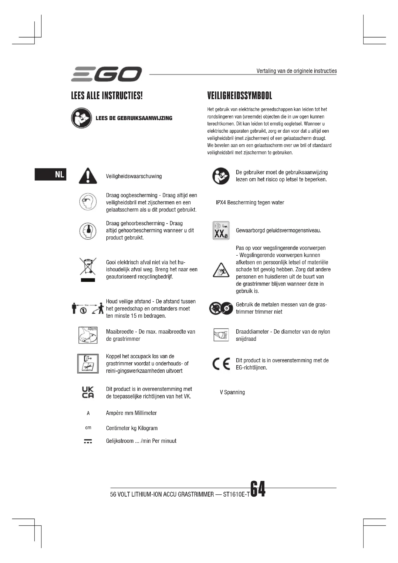 Gewaarborgd geluidsvermogensniveau.Gooi elektrisch afval niet via het hu-ishoudelijk afval weg. Breng het naar een geautoriseerd recyclingbedrijf.Pas op voor wegslingerende voorwerpen - Wegslingerende voorwerpen kunnen afketsen en persoonlijk letsel of materiële schade tot gevolg hebben. Zorg dat andere personen en huisdieren uit de buurt van de grastrimmer blijven wanneer deze in gebruik is. Houd veilige afstand - De afstand tussen het gereedschap en omstanders moet ten minste 15 m bedragen.Gebruik de metalen messen van de gras-trimmer trimmer niet 40cm Maaibreedte - De max. maaibreedte van de grastrimmer 2.4mm Draaddiameter - De diameter van de nylon snijdraadKoppel het accupack los van de grastrimmer voordat u onderhouds- of reini-gingswerkzaamheden uitvoertDit product is in overeenstemming met de EG-richtlijnen.Dit product is in overeenstemming met de toepasselijke richtlijnen van het VK.V Spanning Ampère mm Millimeter Centimeter kg KilogramGelijkstroom ... /min Per minuut56 VOLT LITHIUM-ION ACCU GRASTRIMMER — ST1610E-T 65
