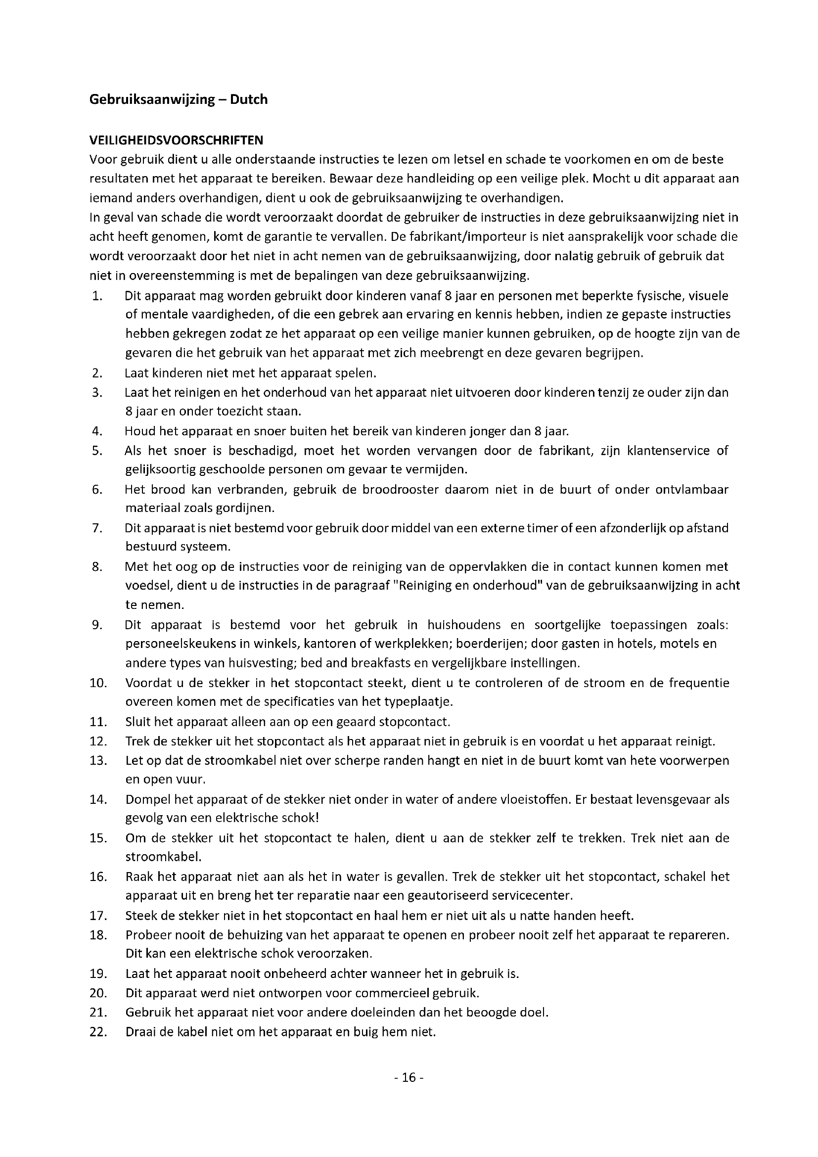 19. Laat het apparaat nooit onbeheerd achter wanneer het in gebruik is.