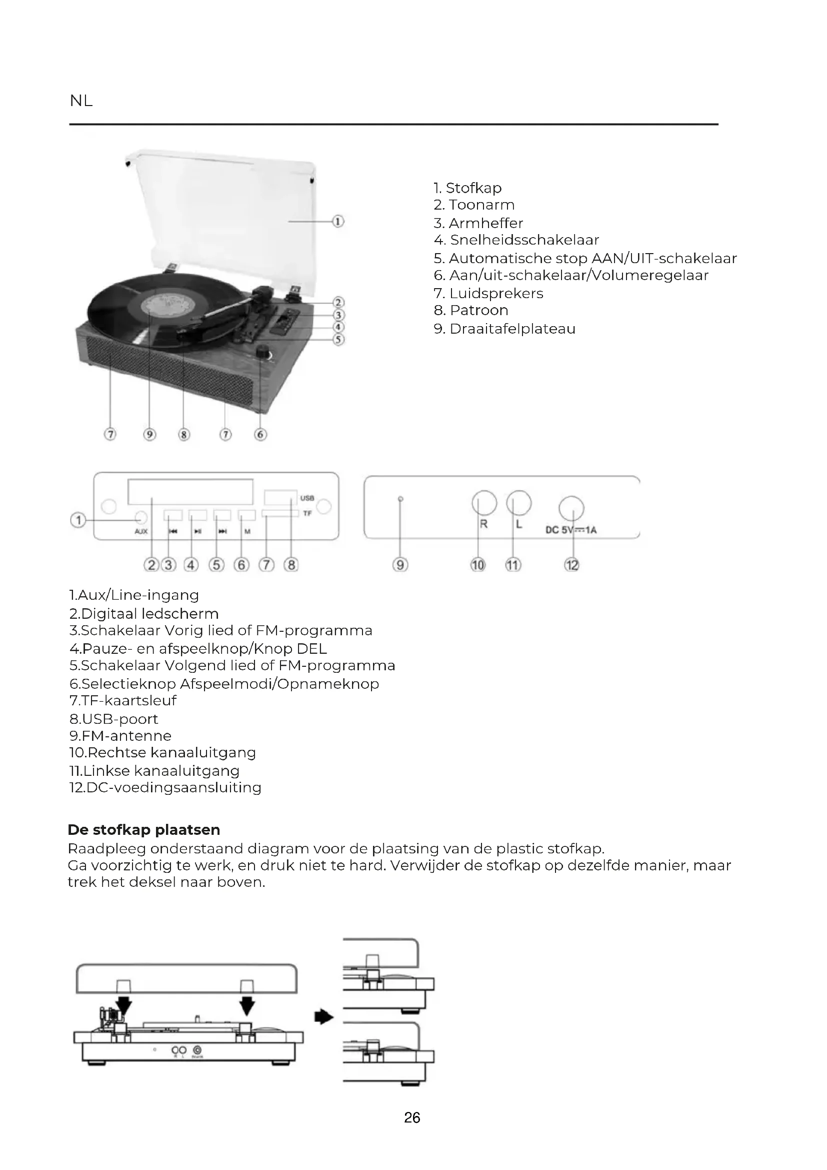 1.Aux/Line-ingang 2.Digitaal ledscherm 3.Schakelaar Vorig lied of FM-programma 4.Pauze- en afspeelknop/Knop DEL 5.Schakelaar Volgend lied of FM-programma 6.Selectieknop Afspeelmodi/Opnameknop 7.TF-kaartsleuf 8.USB-poort 9.FM-antenne 10.Rechtse kanaaluitgang 11.Linkse kanaaluitgang 12.DC-voedingsaansluiting De stofkap plaatsen Raadpleeg onderstaand diagram voor de plaatsing van de plastic stofkap. Ga voorzichtig te werk, en druk niet te hard. Verwijder de stofkap op dezelfde manier, maar trek het deksel naar boven. 26Plaatsing: Plaats uw platenspeler op een veilige plek zodat hij niet kan omvallen en bescher-md is tegen impact van buitenaf. Stroomaansluiting: Sluit de platenspeler aan met een SV DC-adapter. Til de stofkap op: Til de stofkap op en laat hem openstaan als u de platenspeler gebruikt. De stofhoes kan naar beneden wanneer u de vinylplaat afspeelt. Aanzetten: Zet de Aan/uit-knop aan. De knop wordt ook gebruikt om het volume te regelen. In de phonomodus te komen: Druk op de "Play mode select key" om in de PHONO mode te komen. Speed selection: Kies de snelheid tussen 33, 45 en 78 rpm met de snelheidsschakelaar, afhankelijk van de snelheid van de vinylplaat. Leg de plaat op de plaatschijf: Verwijder de plaat voorzichtig uit de hoes en leg de plaat op de plaatschijf. De naald verplaatsen: Verwijder de naaldbescherming, maak de toonarmvergrendeling los en til de toonarm op met de armheffer, beweeg de naald langzaam en zachtjes over de plaat en plaats hem op het buitenste deel van de plaat. Drop the needle: Zodra de naald over de plaat is, gebruik de arm lifter om de toonarm naar beneden te drukken en de naald onder de plaat te plaatsen. Enjoy your music: Zodra bovenstaande stappen zijn voltooid, zal de vinyl plaat beginnen te spelen. (de platenspeler zal automatisch stoppen als de auto-stop schakelaar in de ON positie staat wanneer de naald het einde van de vinyl plaat heeft bereikt. Als de schakelaar in de OFF positie staat, zal hij blijven draaien totdat de toonarm wordt bewogen). Einde: Til de toonarm op en plaats hem op de ondersteuning wanneer u de plaat wilt stoppen. Zet de Aan/uit-knop uit. (De platenspeler zal automatisch stoppen als de autostop-schakelaar op AAN staat. Als de schakelaar op UIT staat, zal de platenspeler blijven draaien tot u met de toonarm beweegt.) Aansluiten op een extern geluidssysteem: Sluit een RCA-audiokabel (niet meegeleverd) aan op de AUDIO-INGANGEN aan de achterkant van de platenspeler. Sluit het andere uiteinde van de kabel aan op de AUDIO-INGANG van de versterker. Rode plug in het rechterkanaal Witte plug in het linkerkanaal USB/TF-functie: (til de toonarm op en leg hem op de ondersteuning) Plaats uw USB-stick of TF-kaart. Wacht een aantal seconden, uw USB- of TF-muziek wordt afgespeeld. Als u deze functie gebruikt, zullen andere functies automatisch stoppen. Als u de opgenomen muziek wilt afspelen, drukt u kort op "M" na USB/TF werk. USB-/TF-opname: Druk op de "Play mode select key" om in de PHONO mode te komen. Plaats de USB stick of TF kaart en houd de "M" toets ingedrukt totdat "REC" op het scherm verschijnt, druk dan op de "PLAY/PAUSE" toets om de opname te starten, de "REC" zal knipperen tijdens de opname. Houd de "M" toets ingedrukt totdat "STOP" op het scherm verschijnt en druk dan op de "PLAY/PAUSE" toets om de opname te stoppen. Als u de opgenomen muziek onmiddellijk wilt afspelen, druk dan kort op de "M" toets om in de "USB/TF" mode te komen en klik op de "Vorige muziek" toets, dan begint het afspelen. Bluetooth-functie: (til de toonarm op en leg hem op de ondersteuning) Ga direct na het inschakelen van dit apparaat naar de Bluetooth-modus. Druk op de "M" toets om de Bluetooth modus te selecteren onder de andere modus. Zorg ervoor dat de ‘koppelingsfunctie’ van het gebruikte Bluetooth-toestel geactiveerd is. Kies de juiste Bluetooth-naam en klik erop om verbinding te maken. FM-functie: (til de toonarm op en leg hem op de ondersteuning) Druk op de ‘M’-knop om de FM-functie te selecteren. Druk lang op "PLAY/PAUSE" voor AUTO SCAN, druk kort op "PLAY/PAUSE" voor STOP SCAN. De huidige muziek verwijderen: Als u de inhoud van de muziekopnemer wilt wissen, houd u de ‘AFSPELEN/ PAUZEREN’-knop ingedrukt tot het woord ‘DEL’ op het scherm verschijnt. Klik opnieuw op de ‘AFSPELEN/PAU-ZEREN’-knop om te bevestigen. De huidig afgespeelde muziek zal verwijderd worden. 27Aux ingang-functie: (til de toonarm op en leg hem op de ondersteuning) Sluit de Aux ingang-kabel aan (andere functies zullen niet werken wanneer de kabel aang-esloten is). De stylusnaald vervangen: Duw de armvergrendeling naar achter om de toonarm te ontgrendelen. Haal de stylusnaald uit het element en plaats een nieuwe naald. Een nieuw styluselement plaatsen: Opgelet: Wees bijzonder voorzichtig tijdens het vervangen om schade aan de toonarm en audiokabels te vermijden. Haal het element voorzichtig uit de toonarm. Maak de audiokabels aan het element voorzichtig los. Vervang door een nieuw element. Zorg ervoor dat de audiokabels goed op hun plaats zitten en maak het element terug vast aan de toonarm. We raden u aan om uw platen schoon te maken met een antistatische doek zodat u er langer van kunt genieten. Omwille van dezelfde reden is het ook aangewezen om de stylus na verloop van tijd te vervangen (elke 250 uur). Stof de stylus regelmatig af met een bijzonder zachte, in alcohol gedepte borstel. (Borstel van achter naar voor op het element) Wanneer u uw platenspeler verplaatst mag u niet vergeten om De beschermende kap over de stylus te plaatsen. Het clipje in de pickuparm te plaatsen. Bild 1 Bild 2 Bild 3 Opmerking Zoals op afbeelding 1 te zien is, moet het gemarkeerde deel inwendig goed gesmeerd zijn om de arm langzaam te laten dalen vanaf het moment dat de hendel wordt geactiveerd. Als de afdaling te langzaam gaat, kan dit tot gevolg hebben dat de muziek niet klinkt zoals het hoort tijdens de eerste momenten van contact tussen de naald en de plaat, en dat de naald 