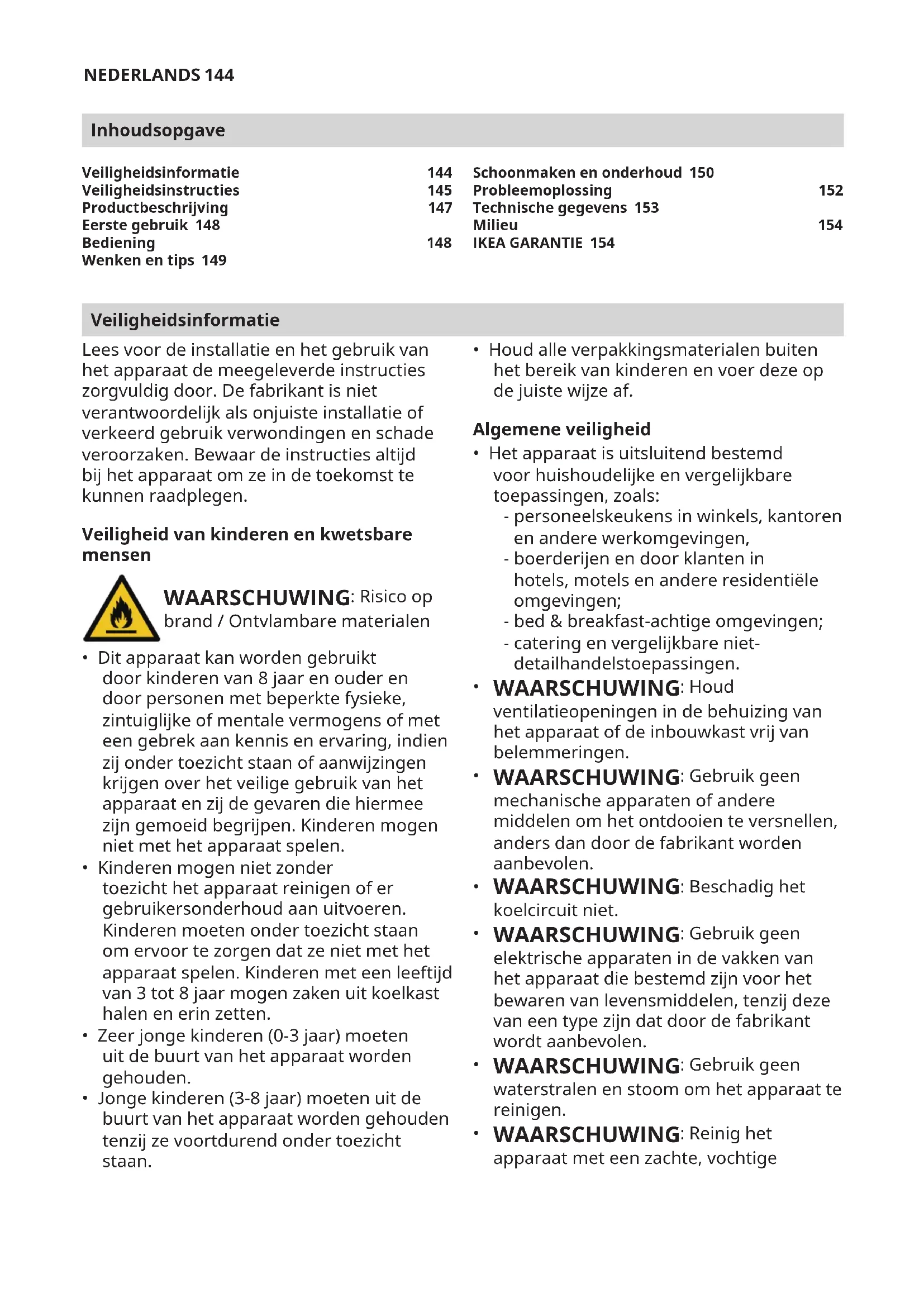 - verduidelijking te vragen in verband met de functies van de IKEA apparaten. Om u beter van dienst te kunnen zijn, verzoeken wij u om eerst de installatie-instructies en de gebruiksaanwijzing zorgvuldig door te lezen alvorens ons te contacteren.NEDERLANDS 156 Hoe u ons kunt bereiken als u hulp nodig hebt Aan het einde van dit boekje staan de telefoonnummers van de door IKEA goedgekeurde Klantenservice. Om u sneller van dienst te kunnen zijn bevelen we aan dat u gebruik maakt van de specieke telefoonnummers die aan het einde van deze gebruiksaanwijzing worden vermeld. Gebruik altijd de nummers die worden vermeld in de gebruiksaanwijzing van het specieke apparaat waarvoor u assistentie nodig hebt. Vergeet niet het 8-cijferige artikelnummer en het 22-cijferige serienummer te vermelden die op het typeplaatje van uw apparaat staan. BEWAAR HET AANKOOPBEWIJS! Dit is uw bewijs van aankoop, dat u ook nodig hebt om de geldigheid van de garantie aan te tonen. Op de kassabon is ook de IKEA naam en het artikelnummer (8 cijfers) van elk door u aangeschaft apparaat vermeld. Hebt u extra hulp nodig? Voor alle bijkomende vragen die geen betrekking hebben op nazorg voor uw toestellen, neemt u contact op met het callcenter van uw IKEA winkel. Wij adviseren u de documentatie die bij het apparaat wordt geleverd zorgvuldig door te lezen voordat u contact met ons opneemt. Informatie over reserveonderdelen - De reserveonderdelen: thermostaten, temperatuursensoren, printplaten en lichtbronnen, zullen voor professionele reparateurs gedurende een minimumperiode van zeven jaar nadat het laatste exemplaar van het model op de markt is gebracht nog beschikbaar zijn. - De reserveonderdelen: deurhandgrepen, deurscharnieren, bakjes en mandjes zullen voor professionele reparateurs en eindgebruikers gedurende een minimumperiode van zeven jaar en deurafdichtrubbers gedurende een periode van minimaal 10 jaar, nadat het laatste exemplaar van het model op de markt is gebracht nog beschikbaar zijn. De reserveonderdelen zijn te vinden op: www.ikea.comČESKY 157 Obsah Bezpečnostní informace Před montáží apoužitím spotřebiče si pečlivě přečtěte přiložené pokyny. Výrobce není zodpovědný za zranění ani škody způsobené nesprávnou montáží nebo používáním. Pokyny uchovávejte vždy se spotřebičem pro budoucí použití. Bezpečnost dětí a zranitelných osob VAROVÁNÍ : Nebezpečí požáru / hořlavé materiály