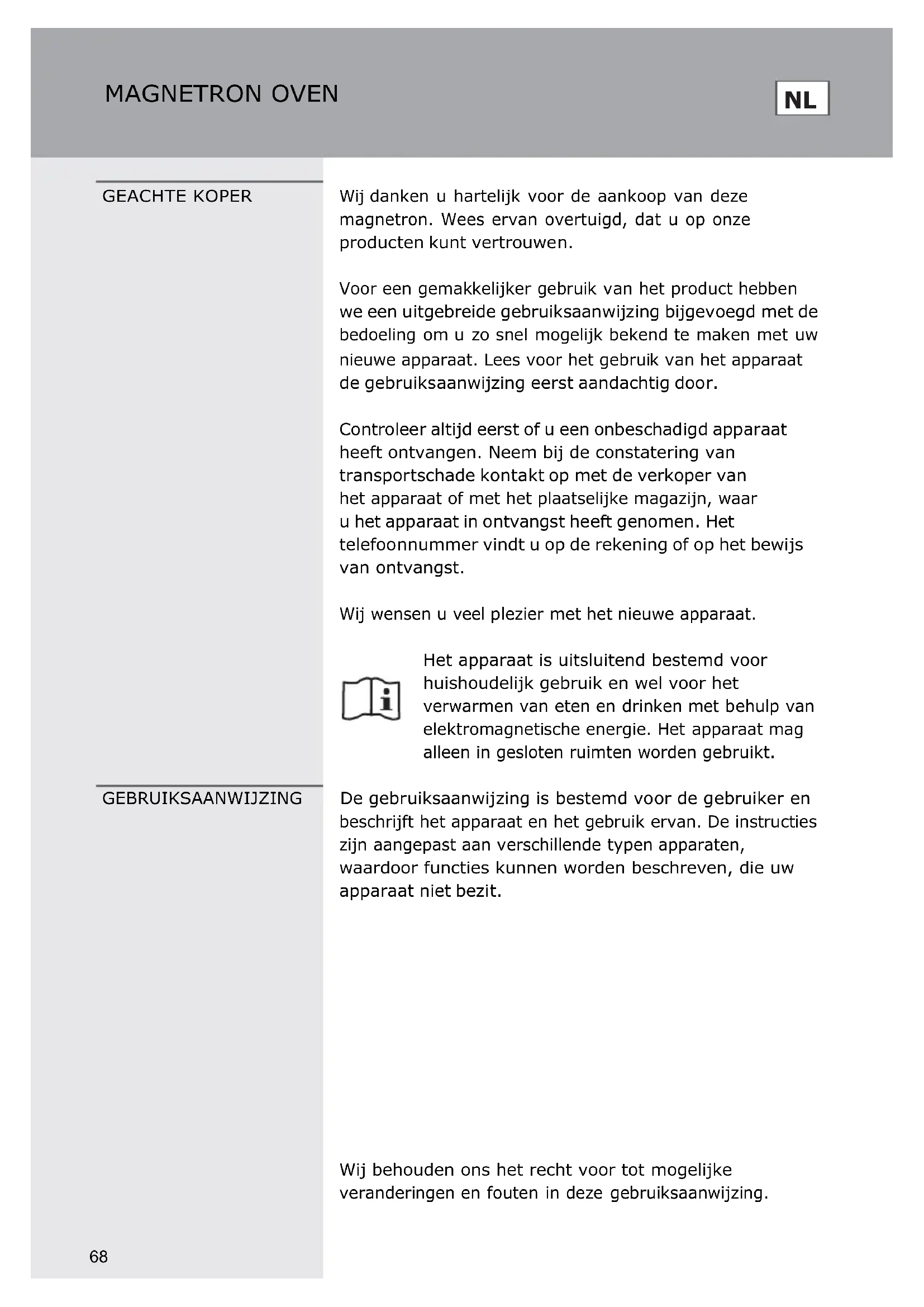 Se pretender obter informações suplementares ou se encontrar um problema, contacte o Serviço dos Consumidores Hisense do seu país (encontrará o número de telefone correspondente no folheto de garantia internacional). Se não existir nenhum Serviço Consumidores Hisense no seu país, informe-se junto do seu revendedor Hisense local ou contate o «Service Department of Hisense Domestic Appliances». Reservado para uma utilização doméstica! DESEJAMOS-LHE MUITO PRAZER NA UTILIZAÇÃO DO SEU FORNO 67MAGNETRON OVEN GEACHTE KOPER Wij danken u hartelijk voor de aankoop van deze magnetron. Wees ervan overtuigd, dat u op onze producten kunt vertrouwen. Voor een gemakkelijker gebruik van het product hebben we een uitgebreide gebruiksaanwijzing bijgevoegd met de bedoeling om u zo snel mogelijk bekend te maken met uw nieuwe apparaat. Lees voor het gebruik van het apparaat de gebruiksaanwijzing eerst aandachtig door. Controleer altijd eerst of u een onbeschadigd apparaat heeft ontvangen. Neem bij de constatering van transportschade kontakt op met de verkoper van het apparaat of met het plaatselijke magazijn, waar u het apparaat in ontvangst heeft genomen. Het telefoonnummer vindt u op de rekening of op het bewijs van ontvangst. Wij wensen u veel plezier met het nieuwe apparaat. Het apparaat is uitsluitend bestemd voor huishoudelijk gebruik en wel voor het verwarmen van eten en drinken met behulp van elektromagnetische energie. Het apparaat mag alleen in gesloten ruimten worden gebruikt. GEBRUIKSAANWIJZING De gebruiksaanwijzing is bestemd voor de gebruiker en beschrijft het apparaat en het gebruik ervan. De instructies zijn aangepast aan verschillende typen apparaten, waardoor functies kunnen worden beschreven, die uw apparaat niet bezit. Wij behouden ons het recht voor tot mogelijke veranderingen en fouten in deze gebruiksaanwijzing.