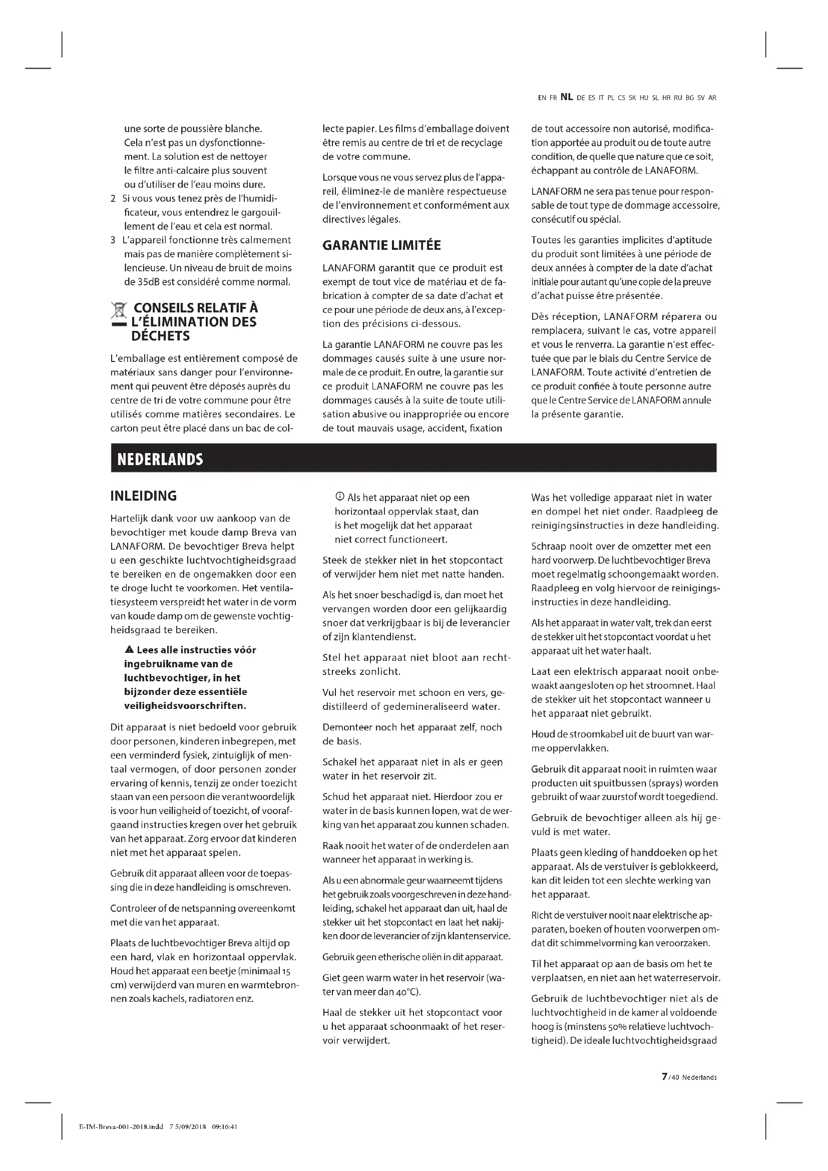 TOT AFVALVERWIJDERING De verpakking bestaat volledig uit materialen die onschadelijk zijn voor het milieu en die naar het sorteercentrum van uw gemeente gebracht kunnen worden om als secundaire grondstoen gebruikt te worden. Het karton mag in de papierbak. De folieverpakking moet naar het sorteer- en recyclagecentrum van uw gemeente gebracht worden. Wanneer u uw apparaat niet meer gebruikt, ontdoe u er dan van op mili- euvriendelijke wijze en in overeenstem- ming met de wettelijke voorschriften. BEPERKTE GARANTIE LANAFORM garandeert dat dit product op de datum van aankoop geen materiaal- of fabricagefouten bezit. Deze garantie blijft geldig gedurende een periode van twee jaar, met uitzondering van de onderstaan- de bepalingen. De garantie van LANAFORM dekt geen schade ten gevolge van normale slijtage van het product. De garantie op een pro- duct van LANAFORM biedt ook geen dek- king tegen schade als gevolg van misbruik, oneigenlijk of verkeerd gebruik, ongeluk- ken, bevestiging van niet-toegestane ac- cessoires, aan het product aangebrachte wijzigingen of andere omstandigheden, van welke aard dan ook, waarover LANA- FORM geen controle heeft. LANAFORM is niet aansprakelijk voor eni- ge vorm van bijkomende, bijzondere of gevolgschade. Alle impliciete garanties van geschiktheid voor een bepaald doel van het product zijn beperkt tot een periode van twee jaar vanaf de oorspronkelijke aankoopdatum op ver- toning van het aankoopbewijs. Na ontvangst zal LANAFORM uw apparaat naar gelang het geval repareren of vervan- gen en naar u terugsturen. De garantie is alleen geldig via het servicecenter van LANAFORM. Deze garantie wordt ongeldig wanneer het onderhoud van dit product aan iemand anders dan het servicecenter van LANAFORM wordt toevertrouwd. DEUTSCH EINLEITUNG Sie haben sich für den Kauf des Kalt- dampf-Luftbefeuchters Breva von LANA- FORM entschieden – vielen Dank für Ihr Vertrauen. Der Breva-Luftbefeuchter sorgt für eine ideale Luftfeuchtigkeit und verhin- dert dadurch Probleme, die durch trocke- ne Umgebungsluft herbeigeführt werden. Das Belüftungssystem verbreitet Wasser in Form von Kaltdampf und erzeugt so den gewünschten Luftfeuchtigkeitsgehalt.