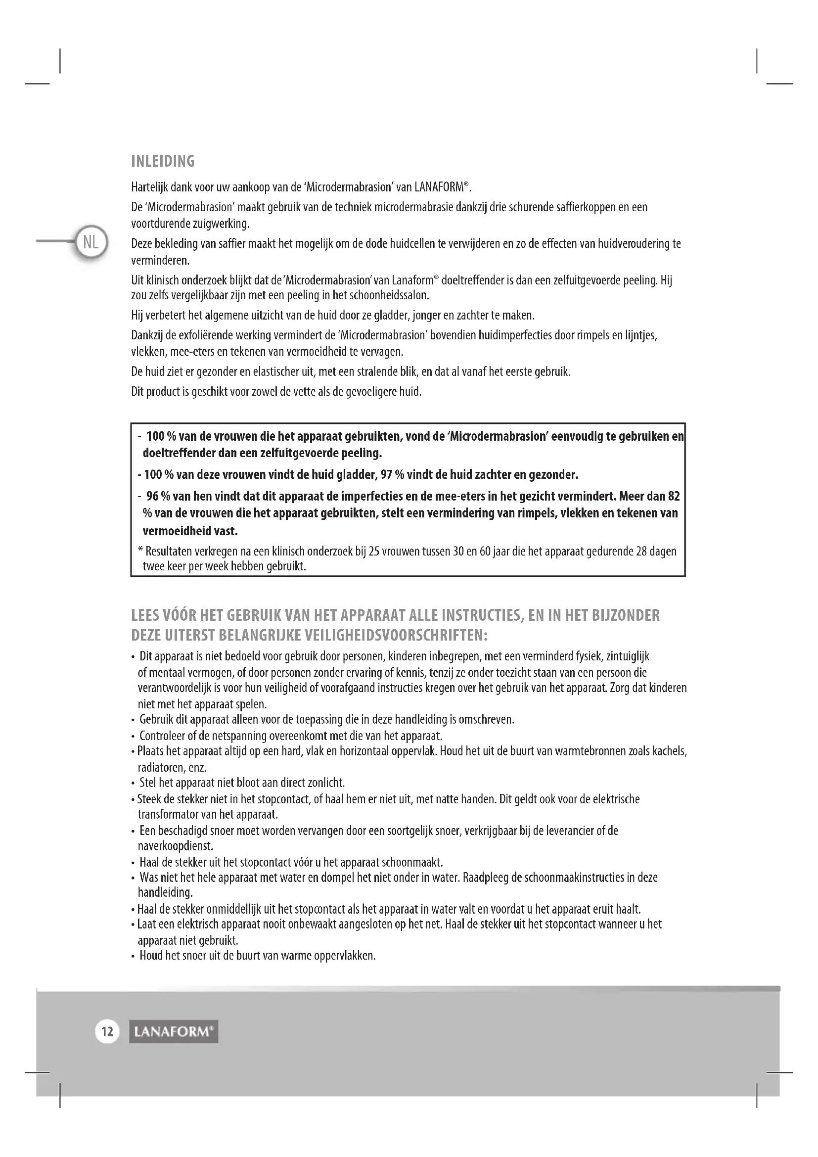 INLEIDING Hartelijk dank voor uw aankoop van de ‘Microdermabrasion’ van LANAFORM®. De ‘Microdermabrasion’ maakt gebruik van de techniek microdermabrasie dankzij drie schurende saffierkoppen en een voortdurende zuigwerking. Deze bekleding van saffier maakt het mogelijk om de dode huidcellen te verwijderen en zo de effecten van huidveroudering te verminderen. Uit klinisch onderzoek blijkt dat de ‘Microdermabrasion’ van Lanaform® doeltreffender is dan een zelfuitgevoerde peeling. Hij zou zelfs vergelijkbaar zijn met een peeling in het schoonheidssalon. Hij verbetert het algemene uitzicht van de huid door ze gladder, jonger en zachter te maken. Dankzij de exfoliërende werking vermindert de ‘Microdermabrasion’ bovendien huidimperfecties door rimpels en lijntjes, vlekken, mee-eters en tekenen van vermoeidheid te vervagen. De huid ziet er gezonder en elastischer uit, met een stralende blik, en dat al vanaf het eerste gebruik. Dit product is geschikt voor zowel de vette als de gevoeligere huid. - 100 % van de vrouwen die het apparaat gebruikten, vond de ‘Microdermabrasion’ eenvoudig te gebruiken en doeltreffender dan een zelfuitgevoerde peeling. - 100 % van deze vrouwen vindt de huid gladder, 97 % vindt de huid zachter en gezonder. - 96 % van hen vindt dat dit apparaat de imperfecties en de mee-eters in het gezicht vermindert. Meer dan 82 % van de vrouwen die het apparaat gebruikten, stelt een vermindering van rimpels, vlekken en tekenen van vermoeidheid vast.