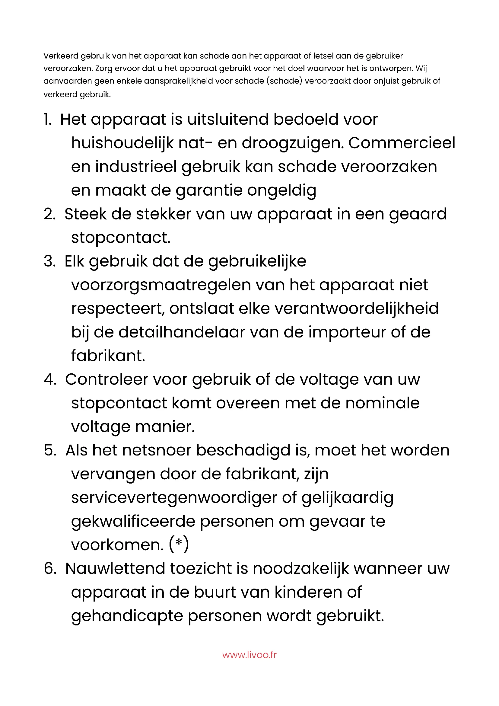 Let op: stofzuig nooit zonder zwart grofmazig net Grijp nooit in het water om op te zuigen. Gevaar voor elektrische schokken. Blazen functie Werken zonder -filter wordt aanbevolen. Sluit de zuigslang aan op de blaasaansluiting op de motorkop. Voeg de benodigde accessoires, met uitzondering van de vloerborstel, toe aan de zuigslang. Ga dan verder zoals hierboven. Schoonmaak en onderhoud Trek de stekker uit het stopcontact. Gebruik een vochtig doek om het apparaat buiten schoon te maken. Gebruik geen oplosmiddel of benzine, anders kan dit leiden tot barsten of vervagen. Leeg na gebruik de tank. Verwijder de motorkop. Giet de vloeistofresten eruit. Voor droog stof, doe hetzelfde als hierboven. Reinig de afvaltank met adamp kleding. Haal dan het -filter of het zwarte grofmazige net eruit.Was ze met water en zeep en laat ze drogen. Vervang de papieren filterzak als deze vol is. Bewaar het apparaat in een droge omgevingwww.livoo.fr
