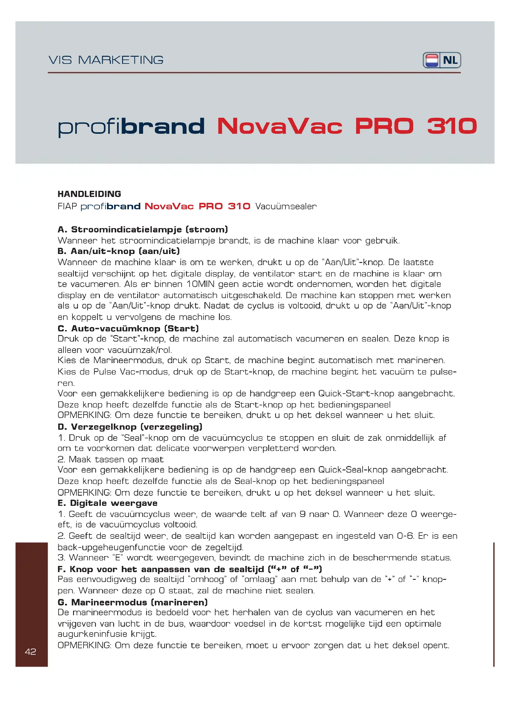 C ED F B G H I J42 profibrand NovaVac PRO 310 HANDLEIDING FIAP profibrand NovaVac PRO 310 Vacuümsealer A. Stroomindicatielampje (stroom) Wanneer het stroomindicatielampje brandt, is de machine klaar voor gebruik. B. Aan/uit-knop (aan/uit) Wanneer de machine klaar is om te werken, drukt u op de “Aan/Uit”-knop. De laatste sealtijd verschijnt op het digitale display, de ventilator start en de machine is klaar om te vacumeren. Als er binnen 10MIN geen actie wordt ondernomen, worden het digitale display en de ventilator automatisch uitgeschakeld. De machine kan stoppen met werken als u op de “Aan/Uit”-knop drukt. Nadat de cyclus is voltooid, drukt u op de “Aan/Uit”-knop en koppelt u vervolgens de machine los. C. Auto-vacuümknop (Start) Druk op de “Start”-knop, de machine zal automatisch vacumeren en sealen. Deze knop is alleen voor vacuümzak/rol. Kies de Marineermodus, druk op Start, de machine begint automatisch met marineren. Kies de Pulse Vac-modus, druk op de Start-knop, de machine begint het vacuüm te pulse- ren. Voor een gemakkelijkere bediening is op de handgreep een Quick-Start-knop aangebracht. Deze knop heeft dezelfde functie als de Start-knop op het bedieningspaneel OPMERKING: Om deze functie te bereiken, drukt u op het deksel wanneer u het sluit. D. Verzegelknop (verzegeling)