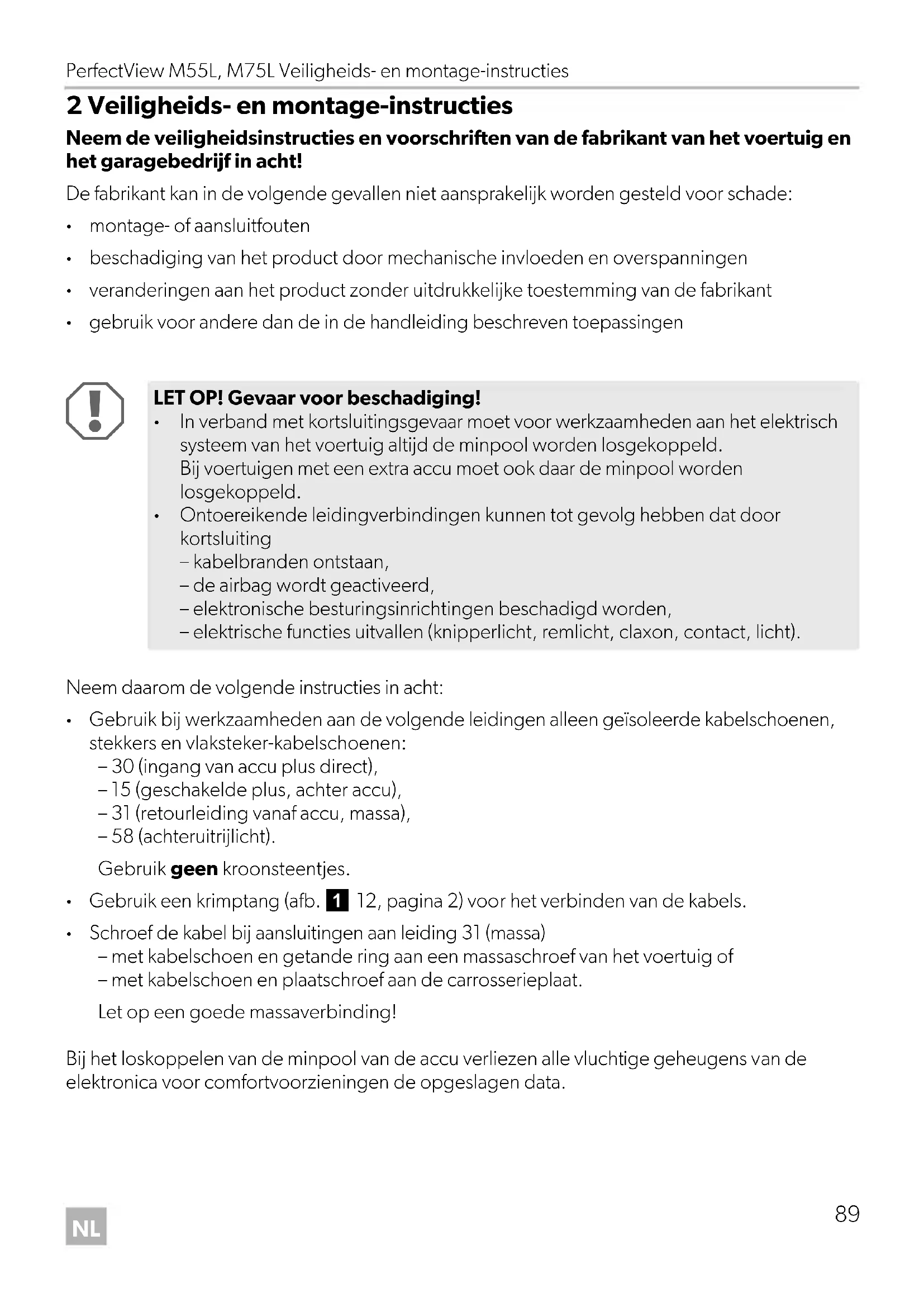 Ontoereikende leidingverbindingen kunnen tot gevolg hebben dat door kortsluiting – kabelbranden ontstaan, – de airbag wordt geactiveerd, – elektronische besturingsinrichtingen beschadigd worden, – elektrische functies uitvallen (knipperlicht, remlicht, claxon, contact, licht). M55L-M75L-IO-16s.book Seite 89 Mittwoch, 20. Dezember 2017 12:32 12Veiligheids- en montage-instructies PerfectView M55L, M75L