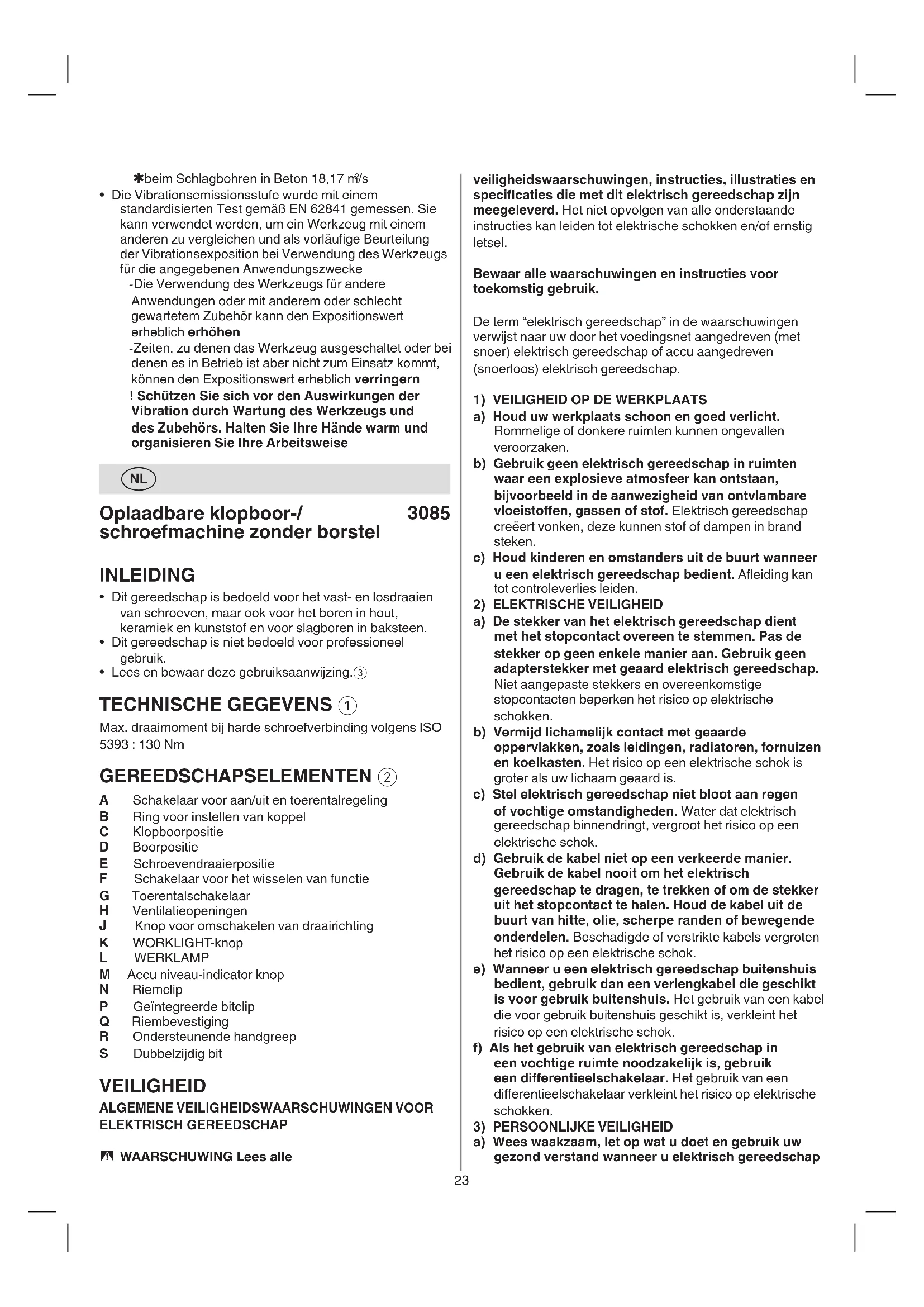 - Lees en bewaar deze gebruiksaanwijzing.3 TECHNISCHE GEGEVENS 1 Max. draaimoment bij harde schroefverbinding volgens ISO 5393 : 130 Nm GEREEDSCHAPSELEMENTEN 2 A Schakelaar voor aan/uit en toerentalregeling B Ring voor instellen van koppel C Klopboorpositie D Boorpositie E Schroevendraaierpositie F Schakelaar voor het wisselen van functie G Toerentalschakelaar H Ventilatieopeningen