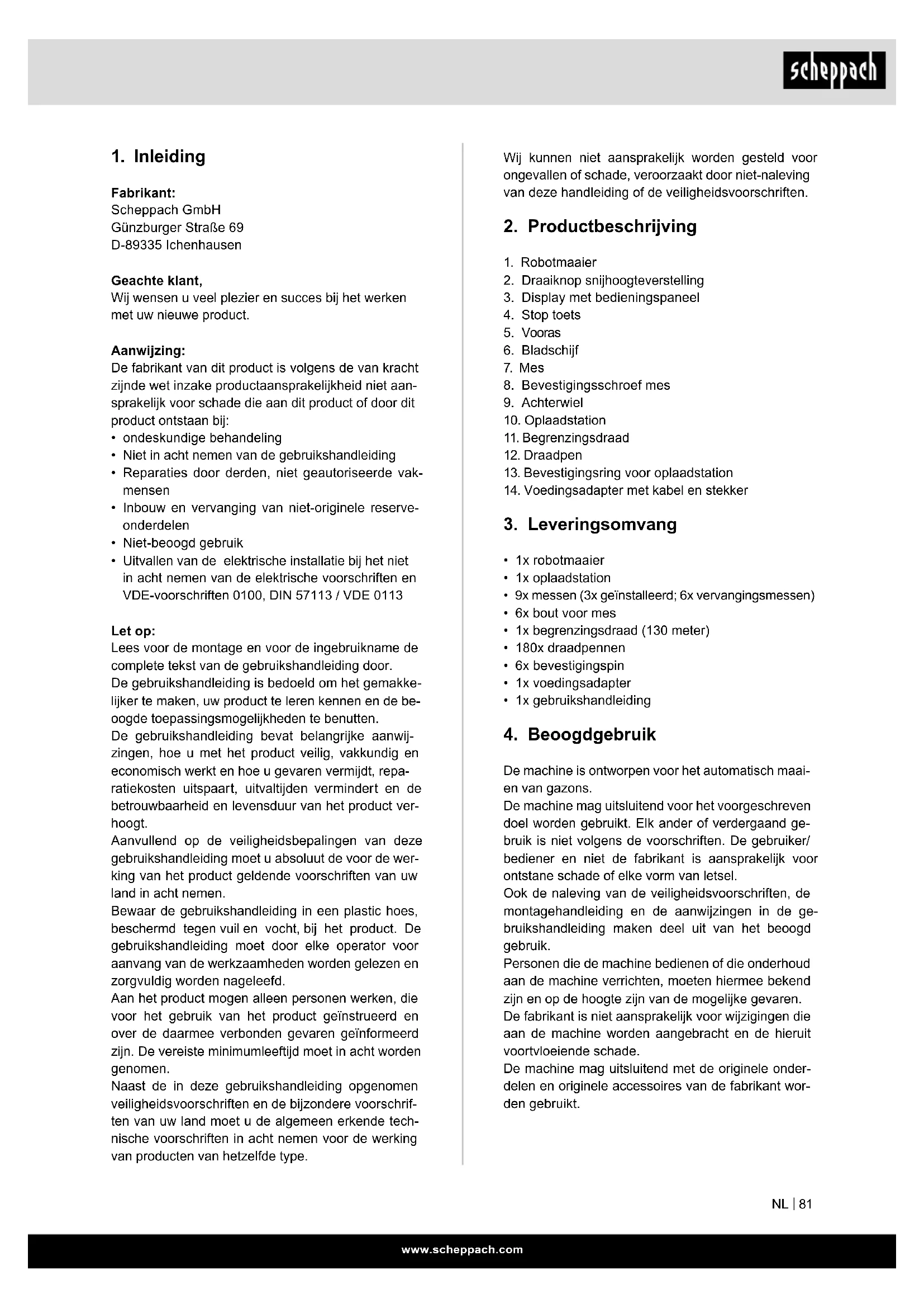 - Uitvallen van de elektrische installatie bij het niet in acht nemen van de elektrische voorschriften en VDE-voorschriften 0100, DIN 57113 / VDE 0113 Let op: Lees voor de montage en voor de ingebruikname de complete tekst van de gebruikshandleiding door. De gebruikshandleiding is bedoeld om het gemakke- lijker te maken, uw product te leren kennen en de be- oogde toepassingsmogelijkheden te benutten. De gebruikshandleiding bevat belangrijke aanwij- zingen, hoe u met het product veilig, vakkundig en economisch werkt en hoe u gevaren vermijdt, repa- ratiekosten uitspaart, uitvaltijden vermindert en de betrouwbaarheid en levensduur van het product ver- hoogt. Aanvullend op de veiligheidsbepalingen van deze gebruikshandleiding moet u absoluut de voor de wer- king van het product geldende voorschriften van uw land in acht nemen. Bewaar de gebruikshandleiding in een plastic hoes, beschermd tegen vuil en vocht, bij het product. De gebruikshandleiding moet door elke operator voor aanvang van de werkzaamheden worden gelezen en zorgvuldig worden nageleefd. Aan het product mogen alleen personen werken, die voor het gebruik van het product geïnstrueerd en over de daarmee verbonden gevaren geïnformeerd zijn. De vereiste minimumleeftijd moet in acht worden genomen. Naast de in deze gebruikshandleiding opgenomen veiligheidsvoorschriften en de bijzondere voorschrif- ten van uw land moet u de algemeen erkende tech- nische voorschriften in acht nemen voor de werking van producten van hetzelfde type.www.scheppach.com