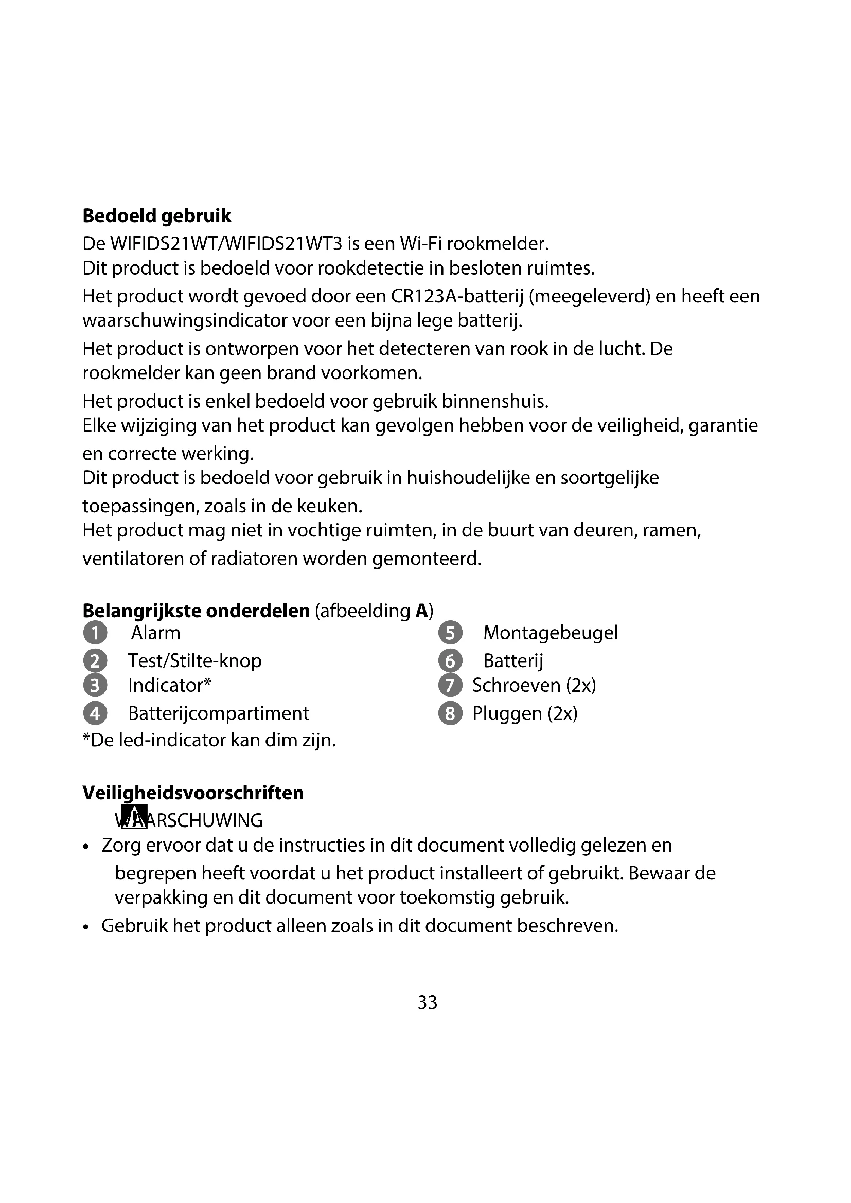 Zie voor meer informatie de uitgebreide handleiding online: ned.is/wids21wt | ned.is/wids21wt333 Bedoeld gebruik De WIFIDS21WT/WIFIDS21WT3 is een Wi-Fi rookmelder. Dit product is bedoeld voor rookdetectie in besloten ruimtes. Het product wordt gevoed door een CR123A-batterij (meegeleverd) en heeft een waarschuwingsindicator voor een bijna lege batterij. Het product is ontworpen voor het detecteren van rook in de lucht. De rookmelder kan geen brand voorkomen. Het product is enkel bedoeld voor gebruik binnenshuis. Elke wijziging van het product kan gevolgen hebben voor de veiligheid, garantie en correcte werking. Dit product is bedoeld voor gebruik in huishoudelijke en soortgelijke toepassingen, zoals in de keuken. Het product mag niet in vochtige ruimten, in de buurt van deuren, ramen, ventilatoren of radiatoren worden gemonteerd. Belangrijkste onderdelen (afbeelding A) 1 Alarm 2 Test/Stilte-knop 3 Indicator* 4 Batterijcompartiment 5 Montagebeugel 6 Batterij 7 Schroeven (2x) 8 Pluggen (2x) *De led-indicator kan dim zijn. Veiligheidsvoorschriften