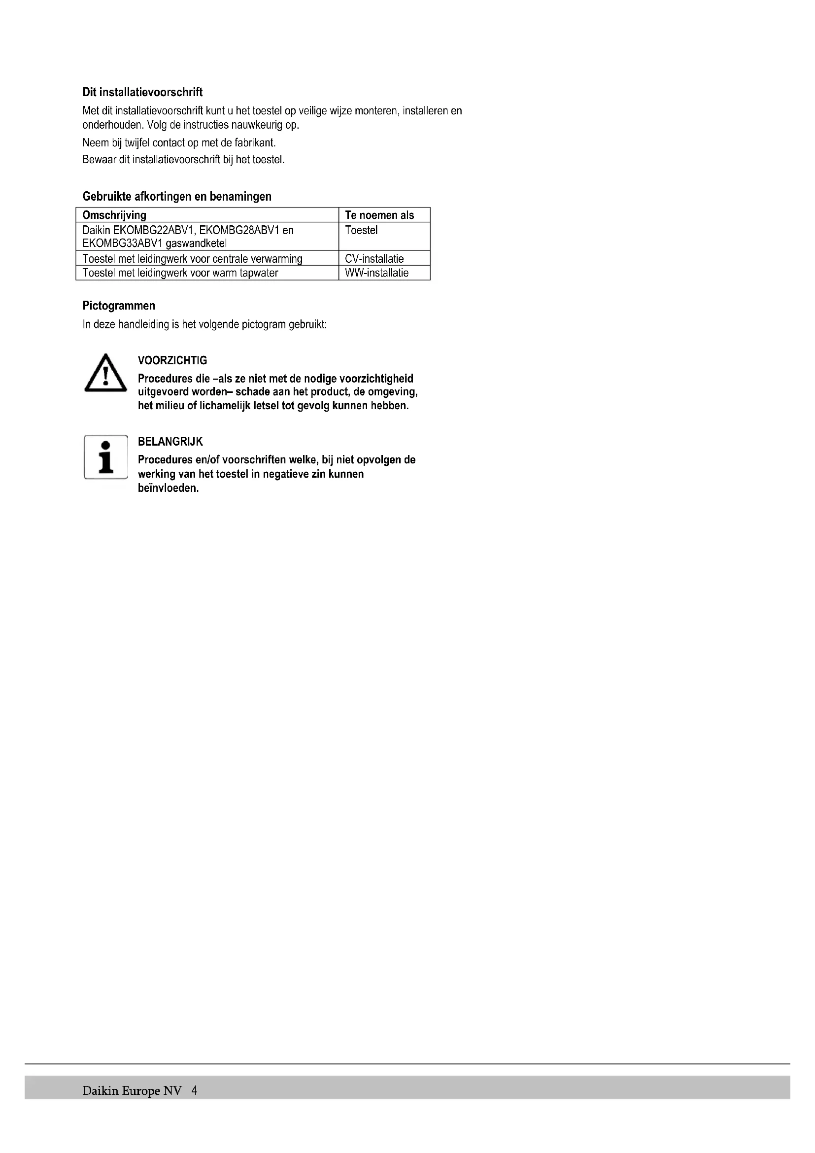 Vermogen in kilowatt BE, DE, GR, IT, PT, FR, PL Bestemmingslanden (EN 437) I2E(s), I2H, IIELL3P, II2H3P, II2Esi3P Toegestane toestel categorie (EN 437) G20-20 mbar G25-25 mbar Gssoort en voordruk (fabrieksinstelling, EN 437) B23, …. C93(x) Toegestane rookgascategorie (EN 15502) Tmax Max. aanvoertemperatuur in °C IPX4D Electrische beschermingsklasse 1 VEILIGHEIDSVOORSCHRIFTEN BELANGRIJK Dit product is uitsluitend voor huishoudelijk gebruik bestemd. De fabrikant Daikin aanvaardt geen enkele aansprakelijkheid voor schade of letsel veroorzaakt door het niet (strikt) naleven van de veiligheidsvoorschriften en -instructies, dan wel door onachtzaamheid tijdens het installeren van de Daikin EKOMBG*ABV1 Hoog Rendement gaswandketel en de eventueel bijbehorende accessoires. Dit apparaat is niet bedoeld voor gebruik door personen (inclusief kinderen) met verminderde lichamelijke, zintuiglijke of geestelijke vermogens, of gebrek aan ervaring en kennis, tenzij zij toezicht of instructie over het gebruik van het apparaat door een persoon die verantwoordelijk is voor hun veiligheid is gegeven. Voor de verschillende disciplines zijn de voorschriften gescheiden vermeld. De gehele installatie moet voldoen aan de geldende lokale technische en (veiligheids)voorschriften van toepassing en dit zowel voor de gasinstallatie, de elektrische installatie, rookgasafvoerinstallatie, dinkwaterinstallatie en CV- installatie. Afhankelijk van het bouwjaar kan een Daikin EKOMBG*ABV1 een onderdeel bevatten waarin keramische vezels zijn verwerkt. Dit kan van toepassing zijn op de kijkglaspakking en op de isolatiepakking van de voorplaat. Gebruik altijd de aanbevolen persoonlijke beschermingsmiddelen bij het werken met keramische vezels.Daikin Europe NV 6 2 TOESTELOMSCHRIJVING
