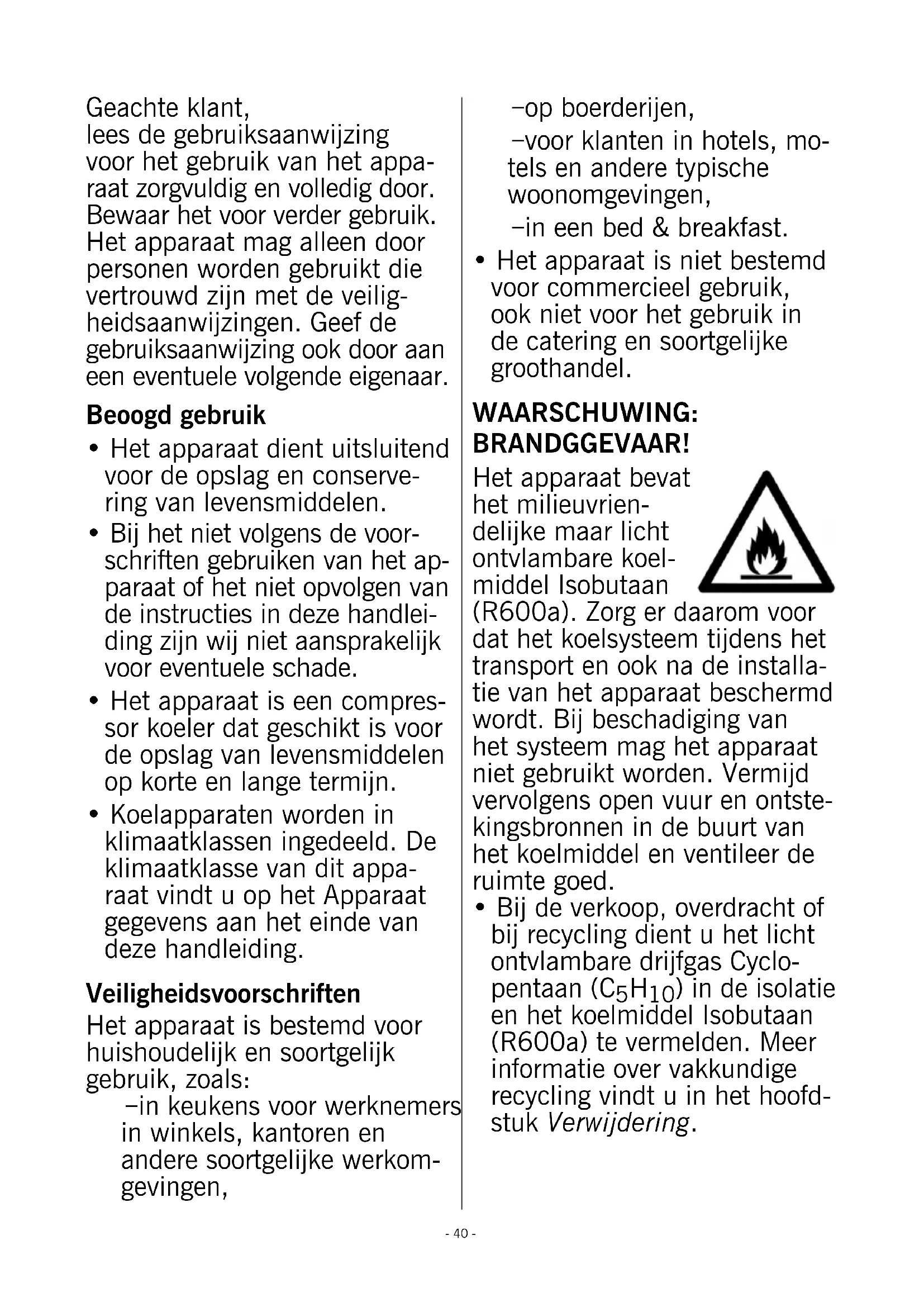 - Het koelmiddel Isobutaan (R600a) en het drijfgas in de isolatie Cyclopentaan (C5H10) zijn licht ontvlambare stoffen en moeten op de juiste wijze worden afgevoerd.