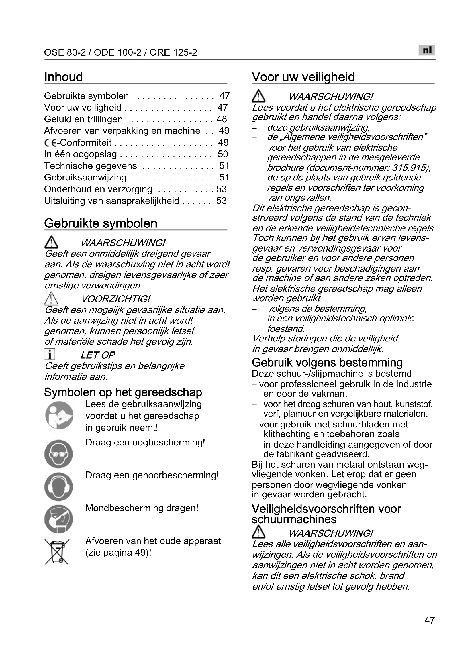 voor het droog schuren van hout, kunststof, verf, plamuur en vergelijkbare materialen, – voor gebruik met schuurbladen met klithechting en toebehoren zoals in deze handleiding aangegeven of door de fabrikant geadviseerd. Bij het schuren van metaal ontstaan weg- vliegende vonken. Let erop dat er geen personen door wegvliegende vonken in gevaar worden gebracht. Veiligheidsvoorschriften voor schuurmachines WAARSCHUWING! Lees alle veiligheidsvoorschriften en aan- wijzingen. Als de veiligheidsvoorschriften en aanwijzingen niet in acht worden genomen, kan dit een elektrische schok, brand en/of ernstig letsel tot gevolg hebben.OSE 80-2 / ODE 100-2 / ORE 125-2