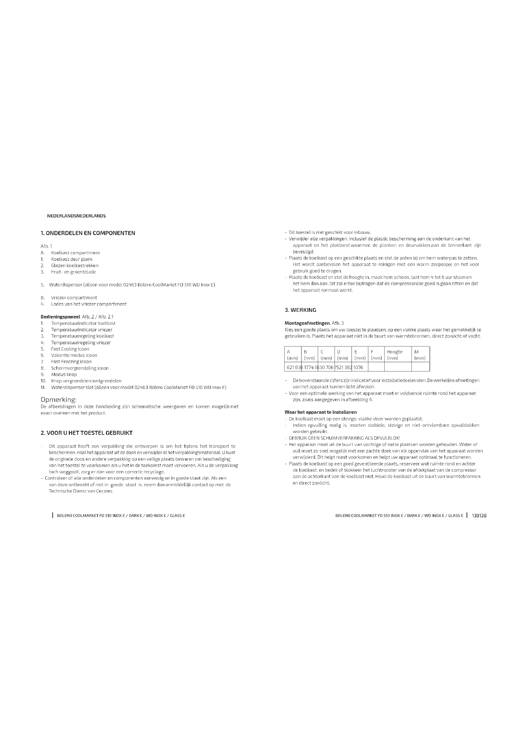 Este símbolo indica que, de acordo com os regulamentos aplicáveis, o produto e/ou bateria deve ser eliminado separadamente do lixo doméstico. Quando este produto atingir o m da sua vida útil, deverá remover as pilhas/ baterias/acumuladores e levá-lo para um ponto de recolha designado pelas autoridades locais. Para obter informação detalhada acerca da forma mais adequada de eliminar os seus equipamentos elétricos e eletrónicos e/ou as correspondentes baterias, o consumidor deverá139138 BOLERO COOLMARKET FD 510 INOX E / DARK E / WD INOX E / GLASS E BOLERO COOLMARKET FD 510 INOX E / DARK E / WD INOX E / GLASS E NEDERLANDS NEDERLANDS - Dit toestel is niet geschikt voor inbouw. - Verwijder alle verpakkingen, inclusief de plastic bescherming aan de onderkant van het apparaat en het plakband waarmee de planken en deurvakken aan de binnenkant zijn bevestigd. - Plaats de koelkast op een geschikte plaats en stel de poten bij om hem waterpas te zetten. Het wordt aanbevolen het apparaat te reinigen met een warm zeepsopje en het voor gebruik goed te drogen. - Plaats de koelkast en stel de hoogte in, maak hem schoon, laat hem 4 tot 6 uur staan en zet hem dan aan. Dit zal ertoe bijdragen dat de compressorolie goed is gaan zitten en dat het apparaat normaal werkt.